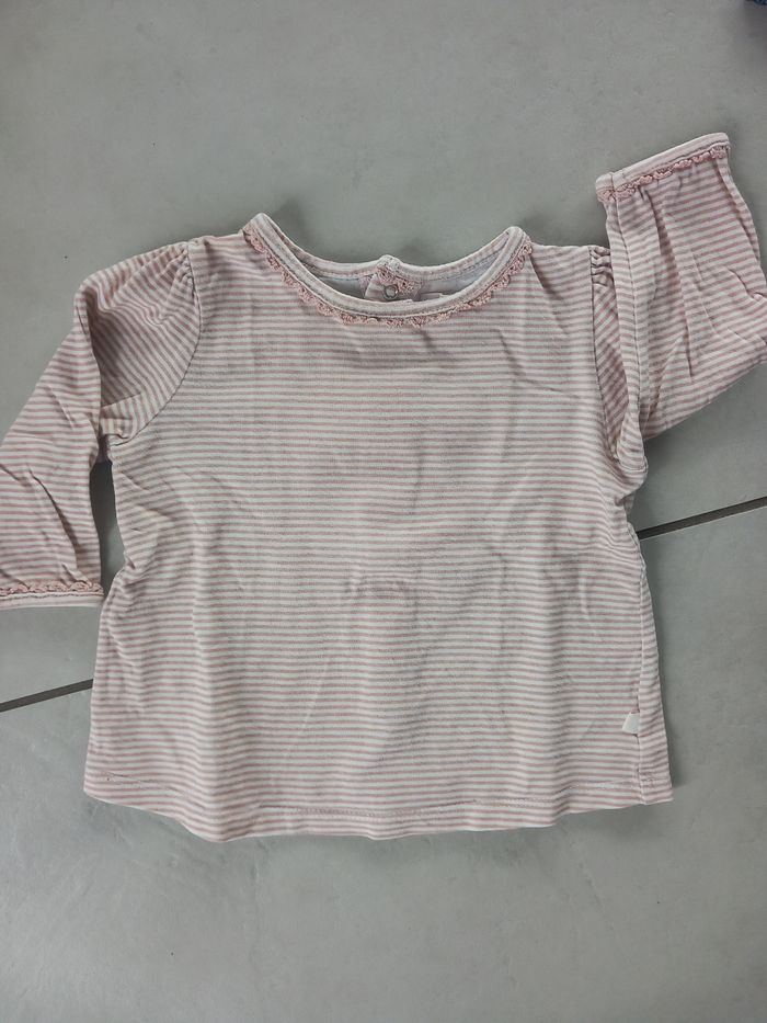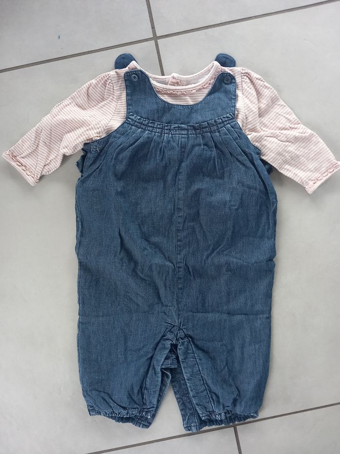 Ensemble composé de : - 1 salopette pantalon en jean bleu. Pressions à l'entrejambe. Bretelles à boutons. 100% coton. - 1 T-shirt manches longues rayé rose et blanc. Pressions dans le dos. Taille : 6 mois Marque : Mini Tape à l'œil État : très bon état