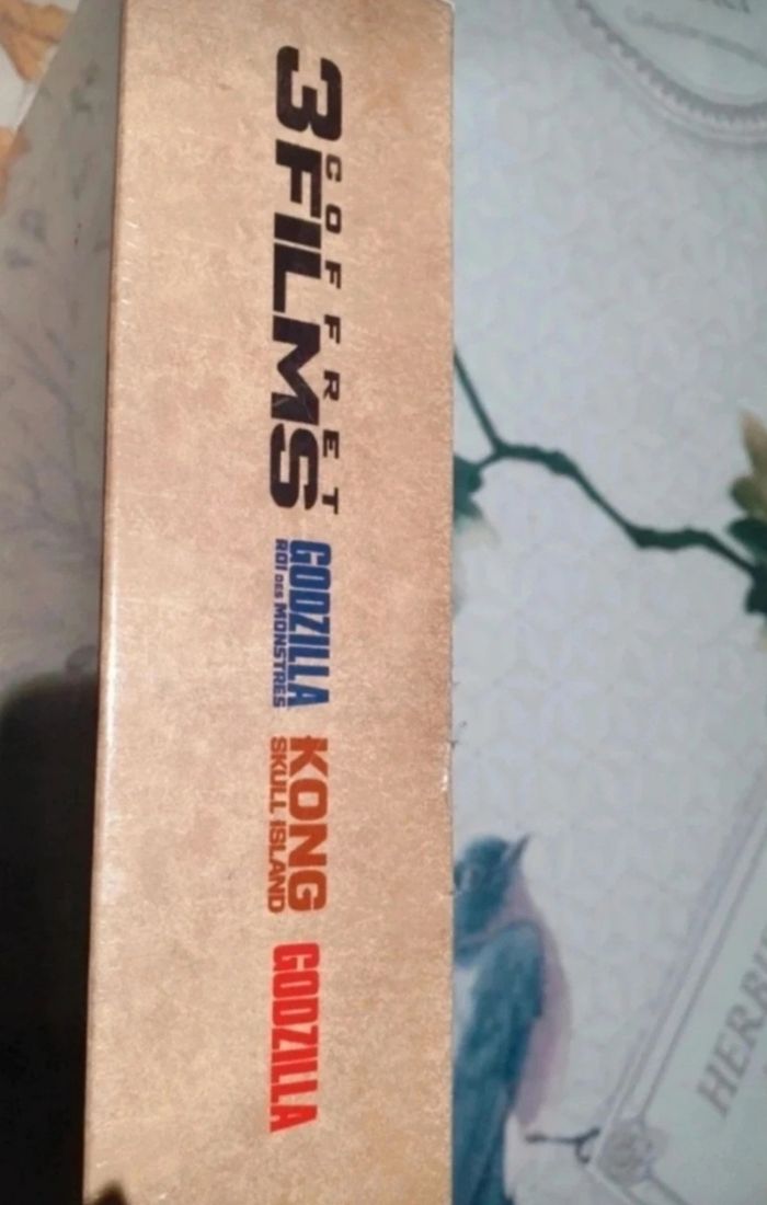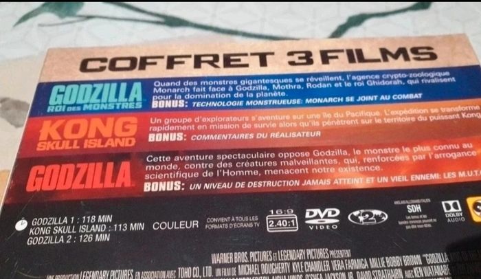 Coffret dvd comprenant 3 films Godzilla Roi des montres 118 mn Kong Skull Island 113 mn Godzilla 126 mn Les 3 films ont une partie Bonus. Ss blister.