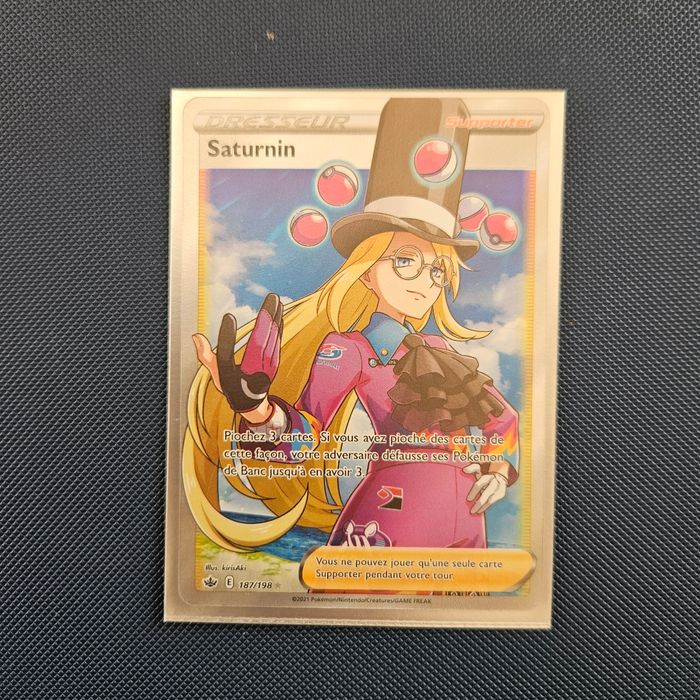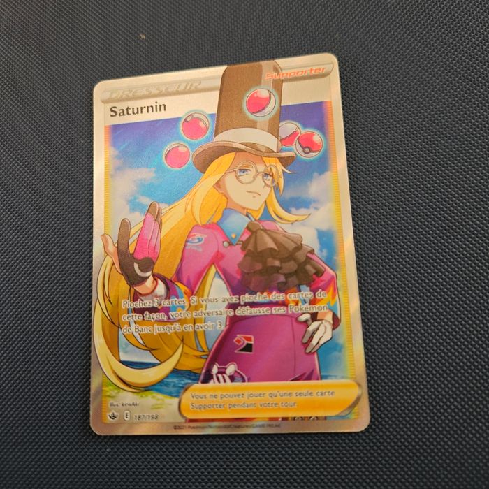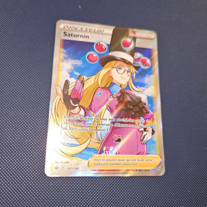 Carte Pokémon Saturnin Full Art 187/198 – Supporter – Épée et Bouclier Prix : 16 € Description : Vend carte Pokémon Saturnin Full Art 187/198. Carte originale en excellent état (sortie de booster, immédiatement protégée). Très belle carte Dresseur recherchée par les collectionneurs. ✨ Full Art Supporter 📦 Envoi soigné sous sleeve + protection rigide 📮 Expédition rapide ou remise en main propre possible Possibilité de lot avec d’autres cartes Pokémon.