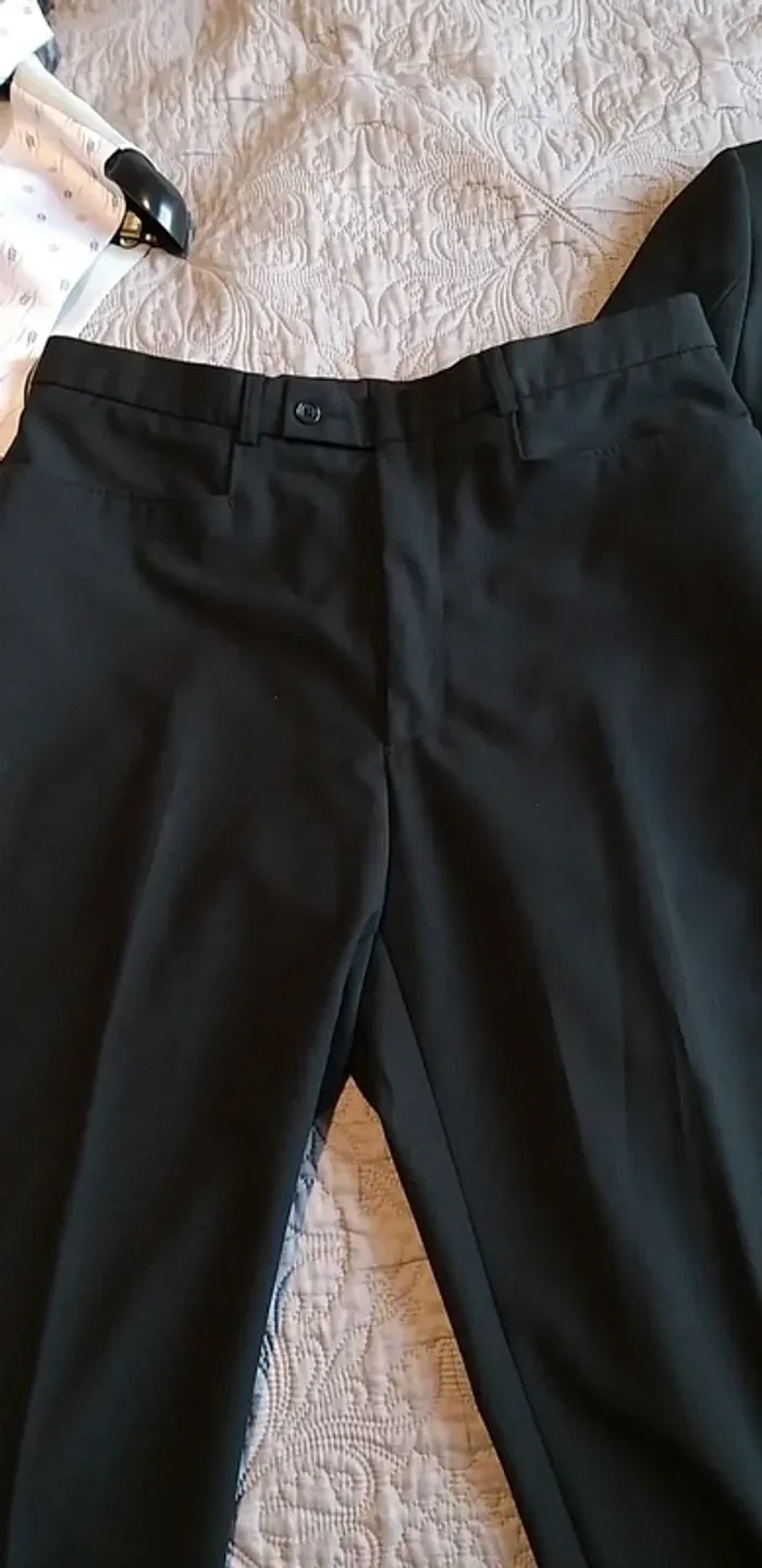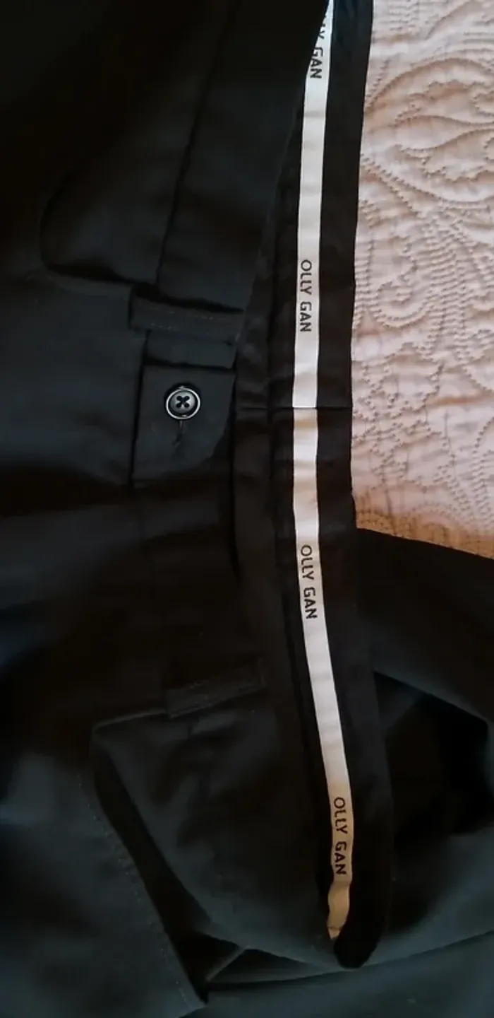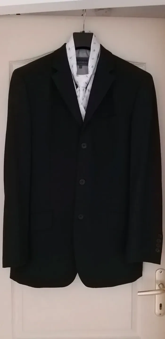 Bonjour, Costume Olly Gan noir (veste taille 50 et pantalon 40/42) gilet et cravate assortis Olly Gan taille 3 (L). Couleur Parme. très bon état Cordialement
