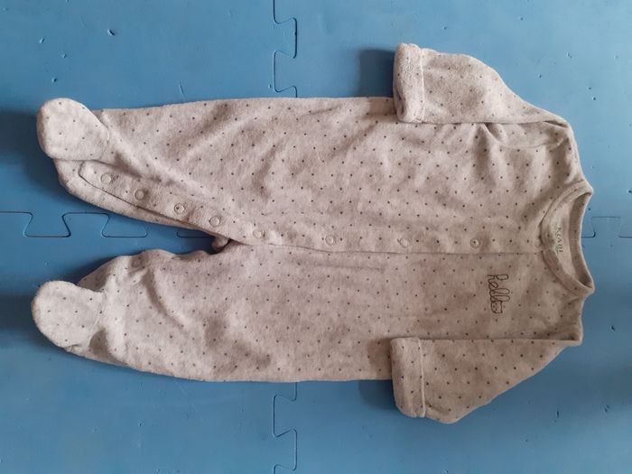 Vends lot de 2 pyjamas velours (bleu marine, gris, boutons pressions sur le devant) + 1 pyjama mi saison (boutons pression dans le dos). Le pyjama gris présente une tache sur l'épaule droite (voir photo), bon état