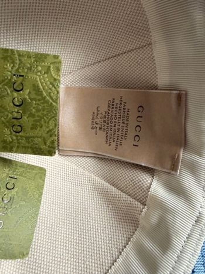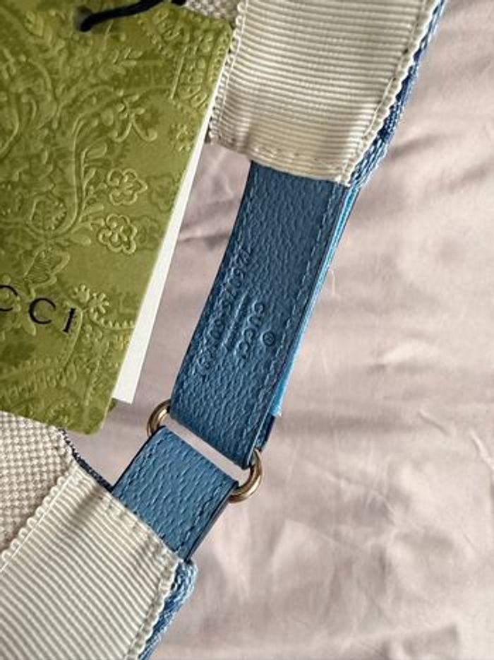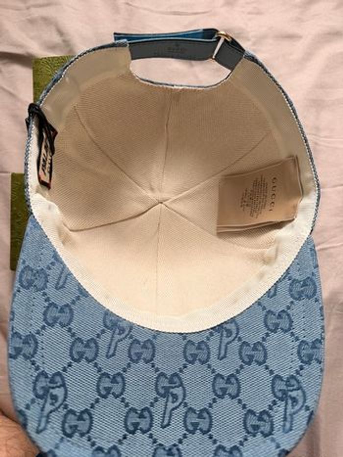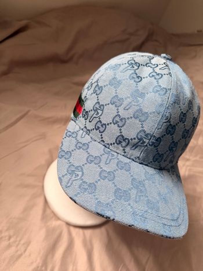 Casquette en denim bleu avec motif GG et bande Gucci. Collaboration unique entre Gucci et Palace. ⭐️ État : 9/10 🎨 Couleur : Bleu 📦 Livraison rapide et soignée.