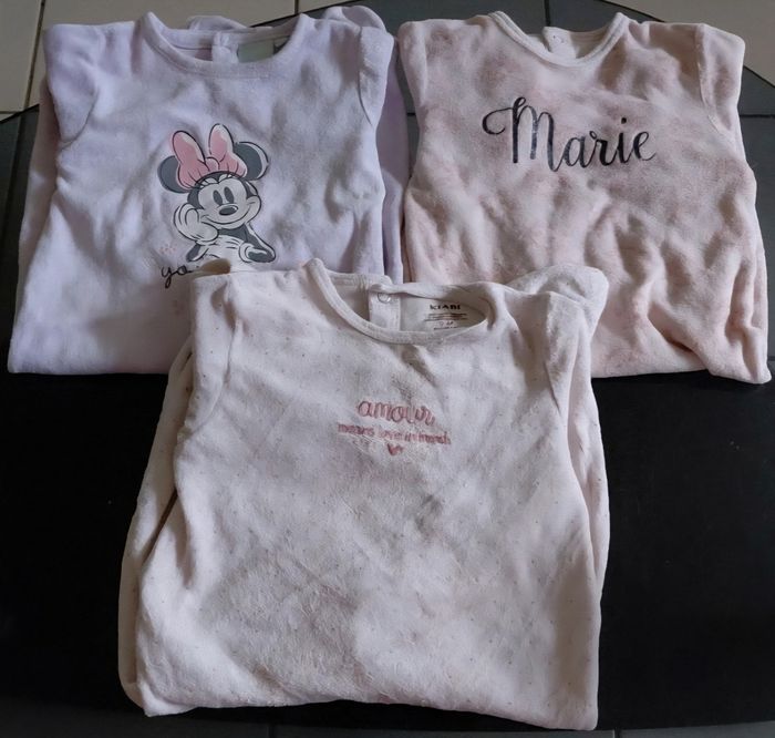 Lot de 3 pyjamas velours une pièce rose claire et violet lila fille 9 mois de 2 marque différentes : 2 disney et un kiabi en très bon état. Matière : violet lilas : 78% coton et 22%polyester. Les 2 Pyjama rose : étiquettes coupé donc je ne sais pas. réductions lots activée jusqu'à-50%.😉 Envoie rapide dans les 24h ➡️📦