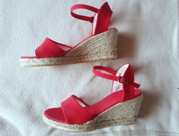 Sandale à talon rouge, pointure 35 en très bon état. Chaussure en toile et corde.