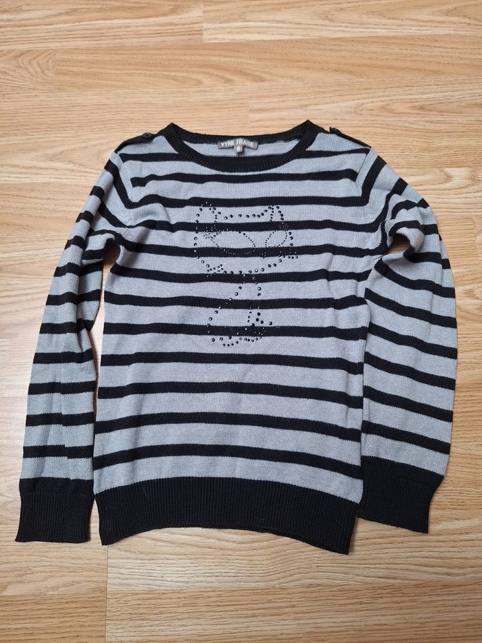 Pull VYNIL FRAISE 8 ans gris rayé noir, motif chat en perles, 2 boutons sur les épaules en décoration.