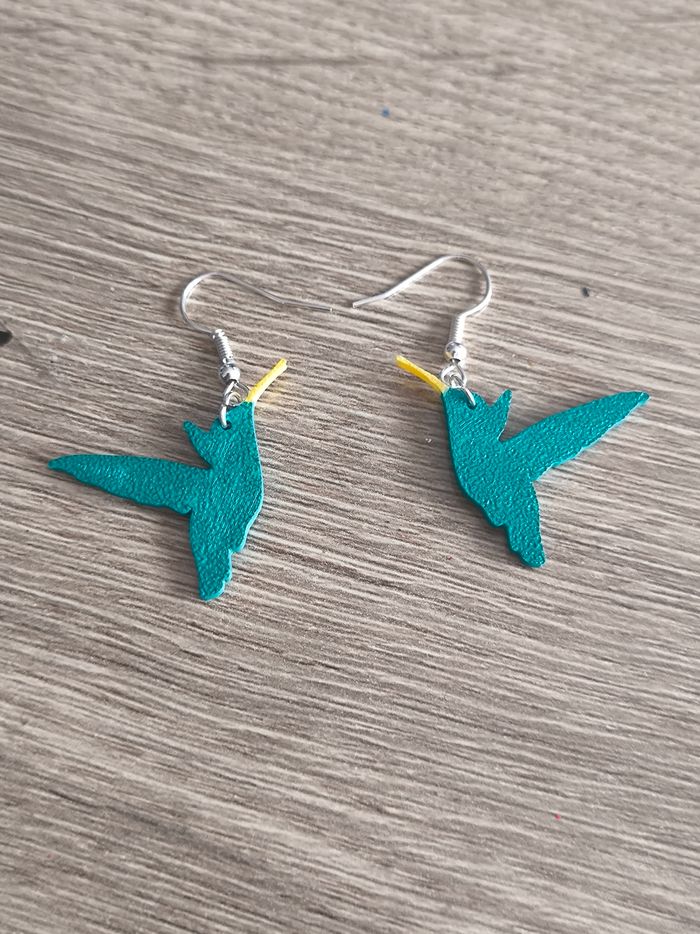 🕊️ Boucles d’oreilles colibri – Fait main – Impression 3D Jolies boucles d’oreilles en forme de colibri, imprimées en 3D, peintes et vernies à la main ✨ • Taille : environ 2,5 cm • Très légères à porter • Attaches couleur argent • Pièce originale et faite main Chaque paire est peinte à la main, ce qui la rend unique 💚 Idéales pour ajouter une touche colorée et originale à une tenue. Envoi soigné 📦 N’hésite pas si tu as des questions !
