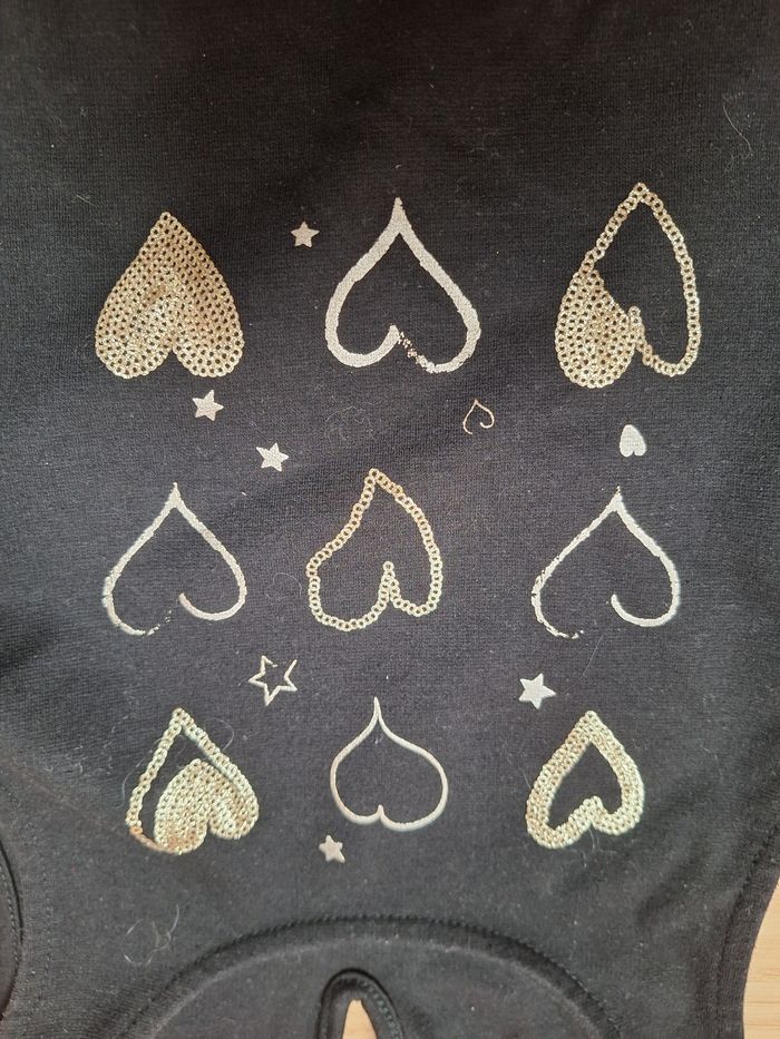 Robe Kids By GEMO 8 ans noire et dorée en mousseline, s'attache grâce à un bouton dans le dos, motif cœurs en paillettes, présence d'une petite tâche devant.