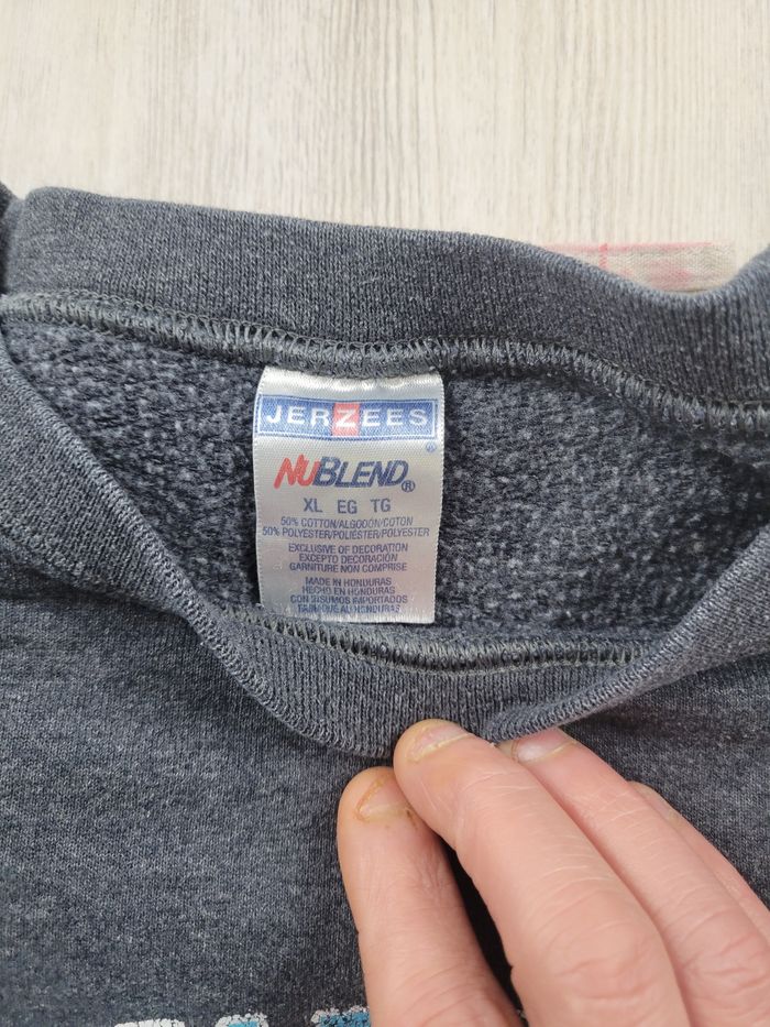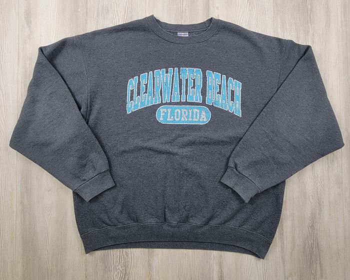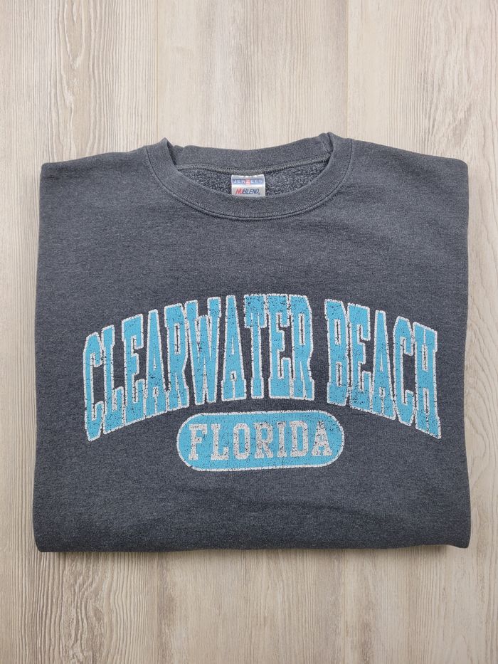 Sweat Jerzees NuBlend gris chiné foncé, XL. Impression “Clearwater Beach Florida” style souvenir US. Coupe ample avec épaules larges et manches larges (vibe vintage / 90s). Très bon état général. Impression légèrement craquelée (effet vintage discret). Aucune tache ni défaut. Composition : 50% coton / 50% polyester. • Épaules : 62 cm • Manches : 58 cm • Longueur : 67 cm Parfait pour un look streetwear oversize ou casual. Envoi rapide sous 24-48 heures