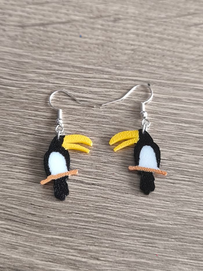 🕊️ Boucles d’oreilles toucans – Fait main – Impression 3D Jolies boucles d’oreilles en forme de colibri, imprimées en 3D, peintes et vernies à la main ✨ • Taille : environ 2,5 cm • Très légères à porter • Attaches couleur argent • Pièce originale et faite main Chaque paire est peinte à la main, ce qui la rend unique 💚 Idéales pour ajouter une touche colorée et originale à une tenue. Envoi soigné 📦 N’hésite pas si tu as des questions !
