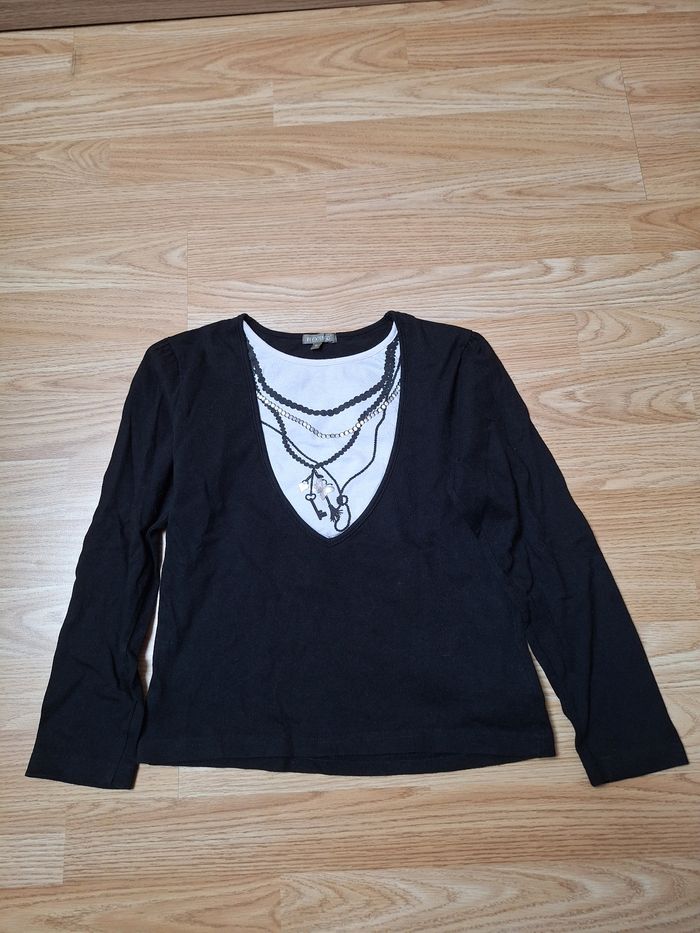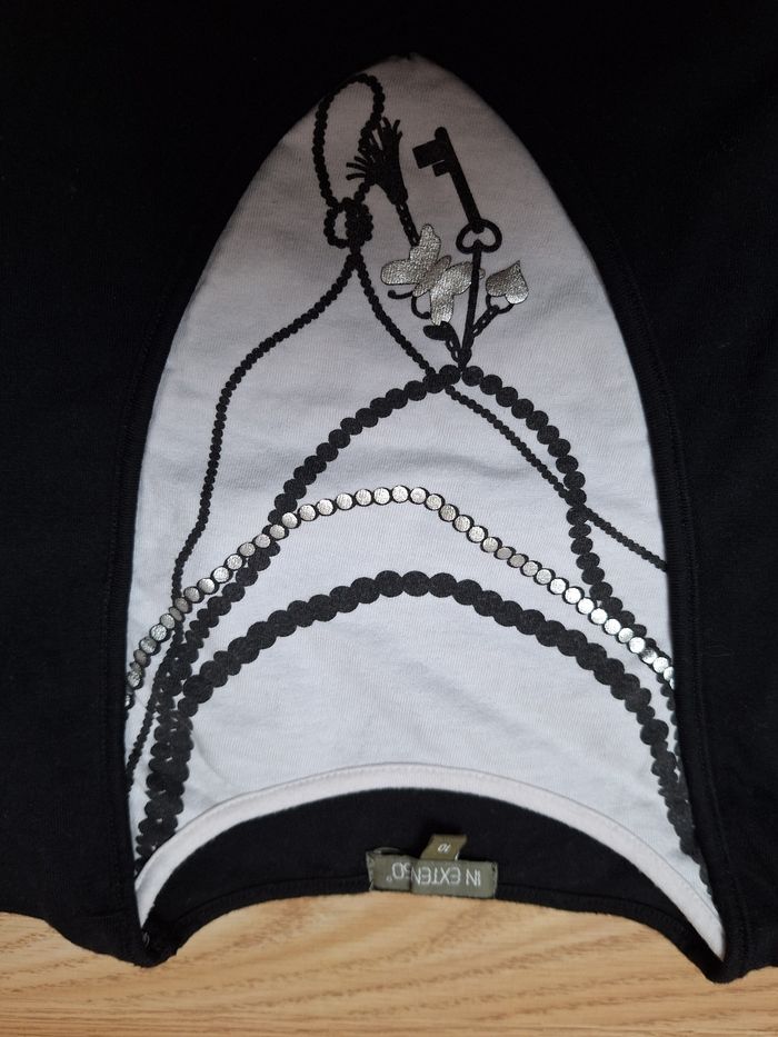 Tee-shirt IN EXTENSO 10 ans noir et blanc manches longues, motif devant colliers avec une clé, un cœur argenté et un papillon argenté.