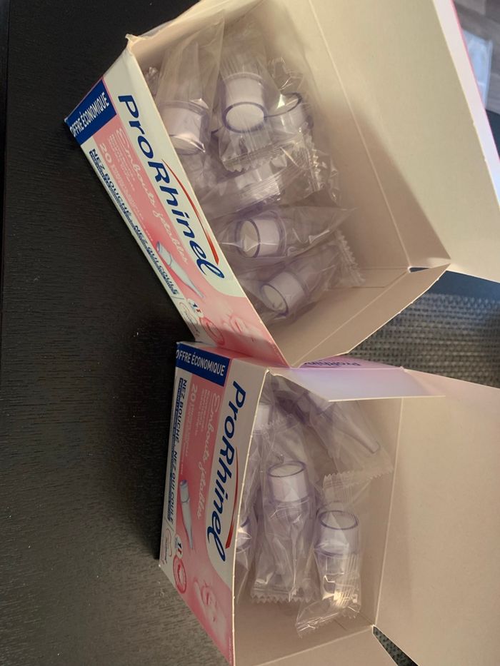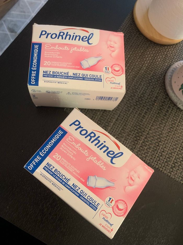 Lot de 2 boîtes embouts jetables ProRhinel – 40 embouts Je vends 2 boîtes d’embouts jetables ProRhinel (20 embouts par boîte). ✔️ Adaptés aux nouveau-nés, nourrissons et jeunes enfants ✔️ Sachets individuels scellés ✔️ Boîtes ouvertes mais embouts neufs et protégés ✔️ Dispositif médical Idéal en prévention pour l’hiver ou en complément du mouche-bébé.