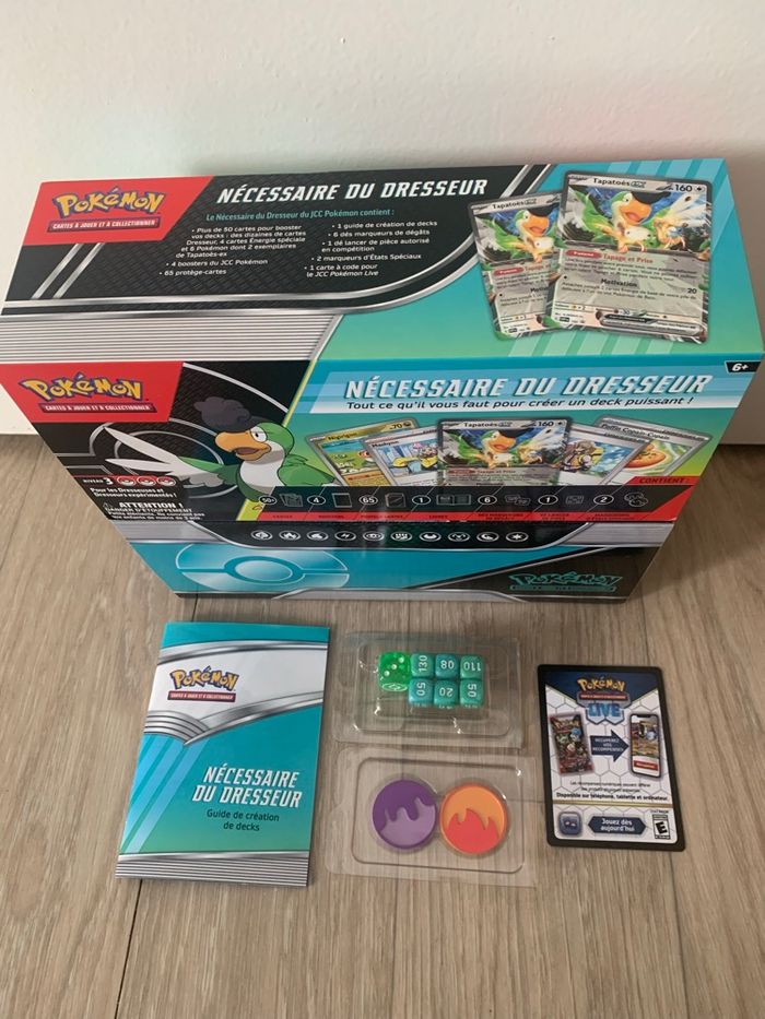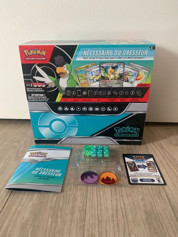 Coffret Pokémon – Nécessaire du Dresseur (sans boosters) Coffret officiel Pokémon « Nécessaire du Dresseur ». Contenu restant : -> Guide de création de decks -> Dés marqueurs de dégâts -> Marqueurs d’états spéciaux -> Carte code Pokémon JCC Live ->Boîte de rangement cartonnée Idéal pour compléter un coffret incomplet, récupérer les accessoires ou pour rangement de cartes. Bon état général (voir photo). Remise en main propre possible / Envoi possible.