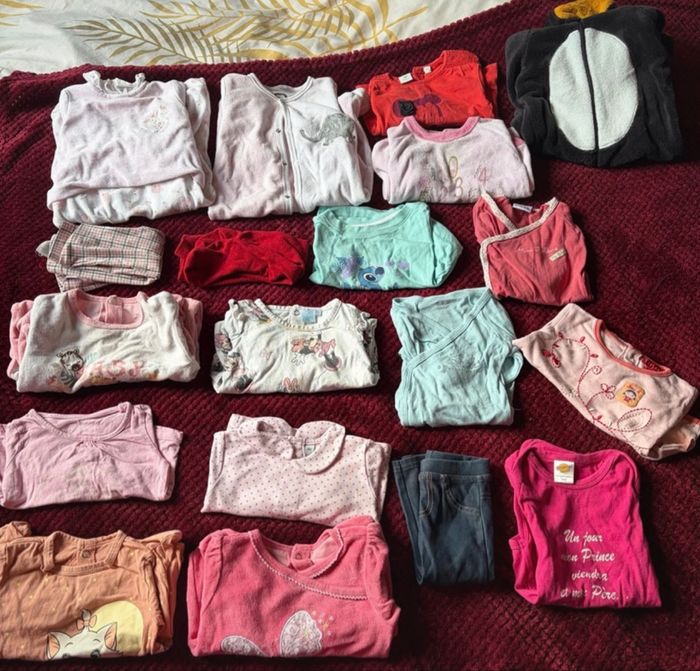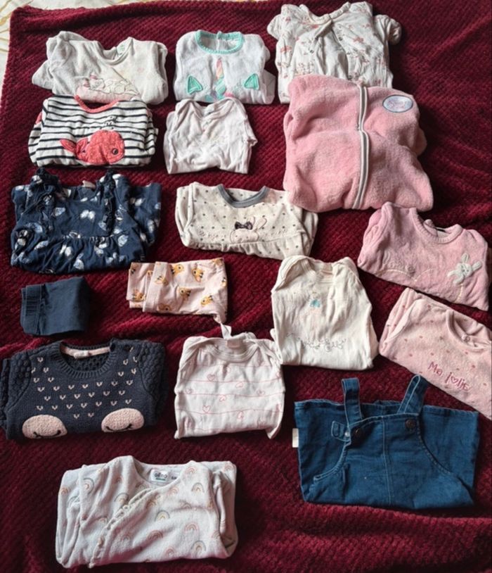 Comprenant tout marque 17 pyjama ( dont 1 avec un accro derrière que je donne + 2 tache) 1 haut de pyjama 3 combinaison polaire 13 bodies ( dont 2/3 taches que je donne) 5 t-shirt 7 bas ( collant legging jeans) 1 pull 1 robe 1 salopette robe 8 t-shirt 1 veste polaire 1 combinaison Prix negociable