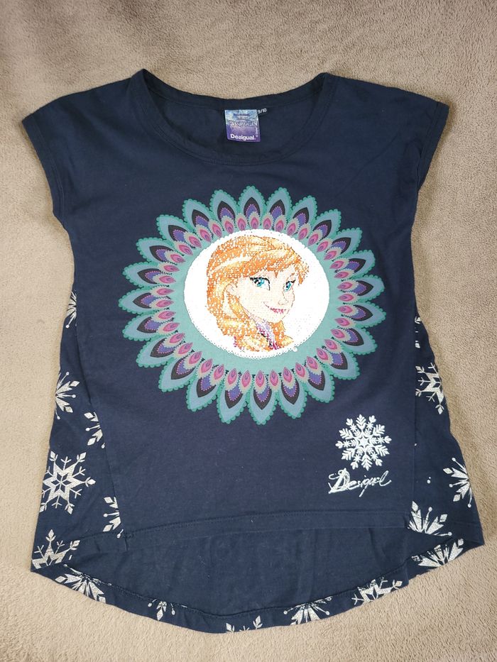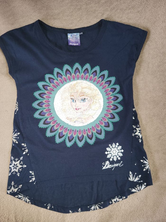 T/Shirt "Desigual" - Taille 9 / 10 Ans Manches courtes coloris bleu marine avec motif Disney Frozen à l'effigie de La Reine des Neiges en sequins magiques 2 visages Elsa / Anna Dans le dos imprimés flocons de neige argenté pailleté 100% Coton #virgy61fille9ans #virgy61fille10ans