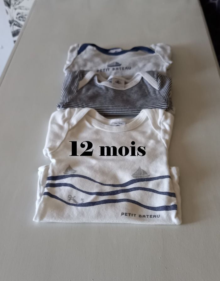 Lot 3 bodies Petit Bateau Manches longues 1 rayé 1 gris 1 blanc Taille 12 mois #12moisenfants_imoddeco