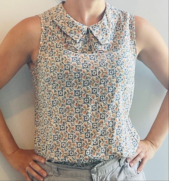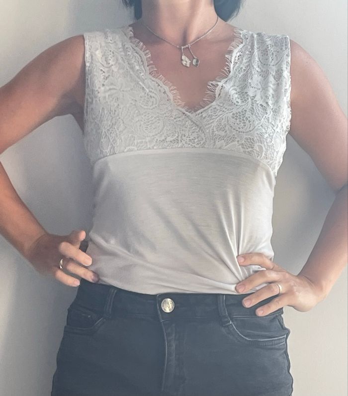Lot de 3 débardeurs / tops / hauts été pour femme : * Débardeur / haut / top blanc Marque : Promod Jolis détails sur le devant et bouton/ Très léger Plus d’étiquette de taille mais convient à un 36 ou petit 38 * Joli débardeur été Sans manches Multicolore blanc bleu et orange avec fleurs Superbe col avec collerette et bouton sur l’arrière Un bouton de rechange Taille 38 mais idéal pour 36 Marque inconnue * Joli débardeur tee shirt été léger Un trou à l’intérieur d’une manche , ne se voit donc pas du tout porté (voir photo ) Légère tache sur le devant (se voit peu mais je mentionne) (voir photo) Gris très clair Marque : H&M Taille : S #stefetjuju51femme3638 maison non fumeurs bien d’autres choses dans mon dressing de nouveaux articles très régulièrement nombreux # dans mon profil pour faciliter vos recherches merci pour votre visite et belle journée ☺️ #debardeur #blanc #été #lot #leger #fleur #dentelle #haut #top