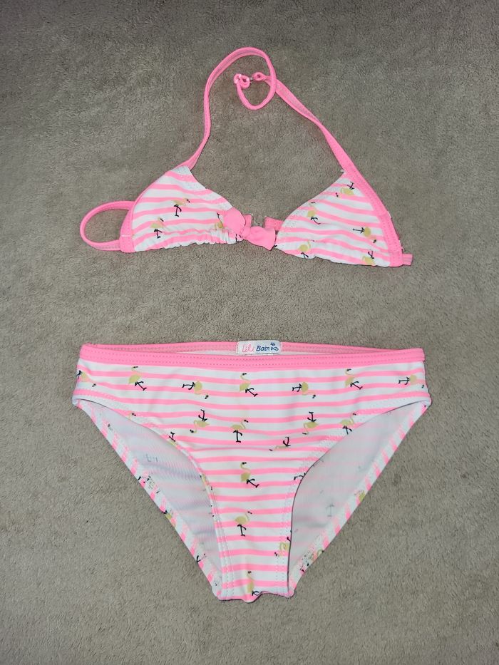 Maillot de bain 2 pièces style bikini Lili bain Tayures roses et blanches motifs flamants roses Porté plusieurs fois #virgy61fille6ans