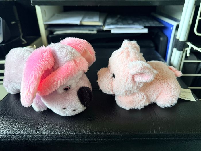 Peluches petit chien et porcinet État : Très bon état Taille : Le chien 18 cm, Le porcinet 16 cm Pour les 5 premiers acheteurs : Pour chaque commande = une petite peluche offerte. Dans la limite du stock disponible.