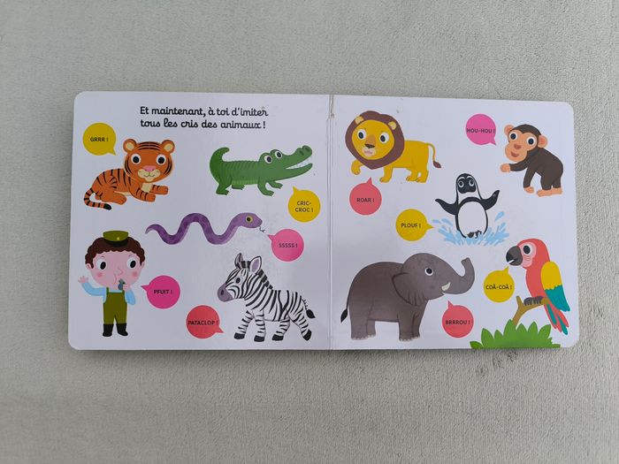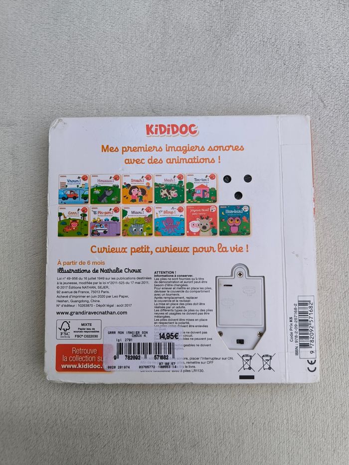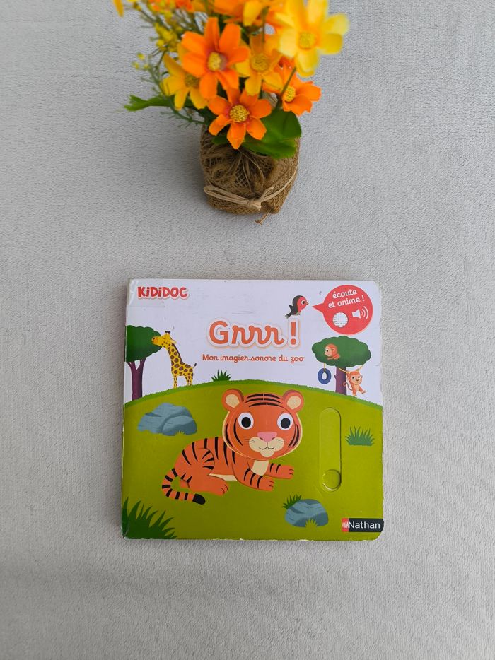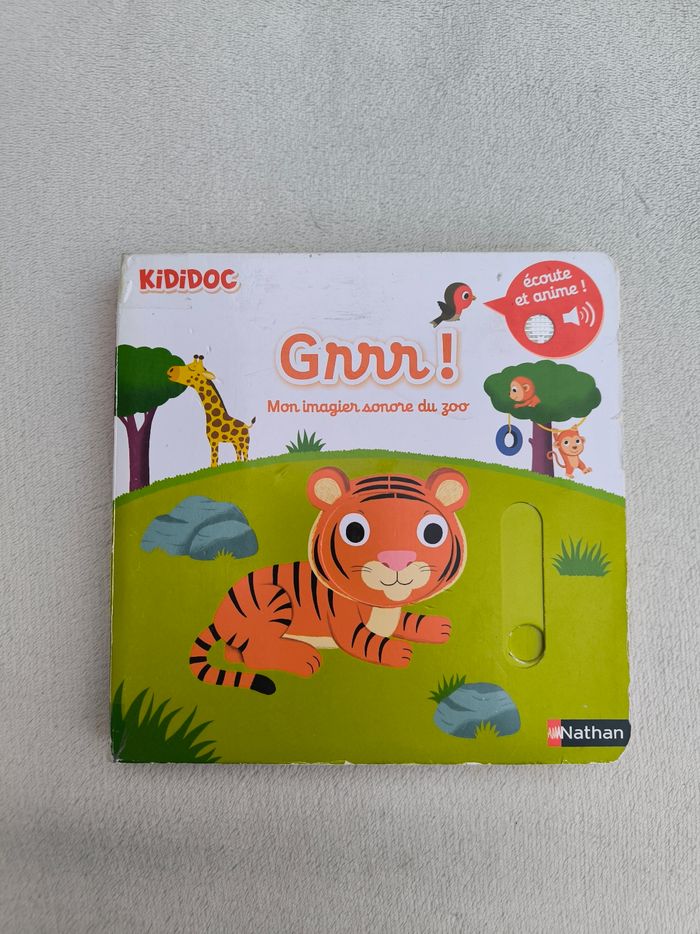 Livre imagier sonore Kididoc : Grrr, numéro 6 Éditions Nathan À partir de 6 mois • Pages cartonnées • Animations, imagier sonore du zoo -> Perroquet, éléphant, singe, tigre • Intérieur du livre en très bon état • Dernière tranche intérieure abîmée • Coins et arêtes abîmés/scotchés Fonctionne Piles incluses En bon état #evelyne_livres