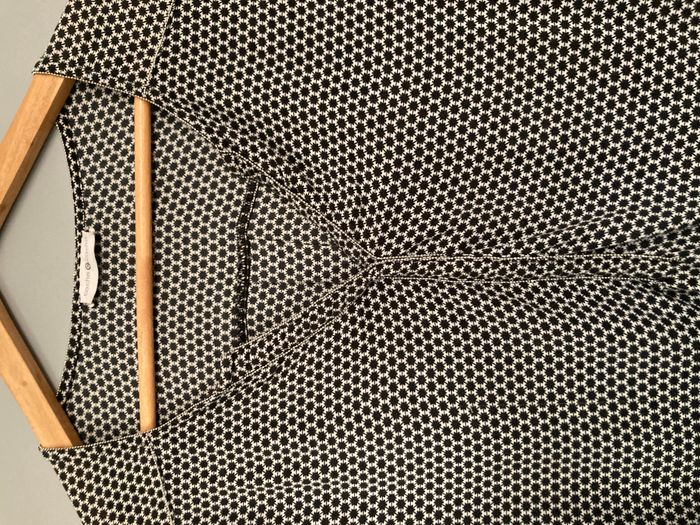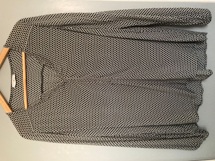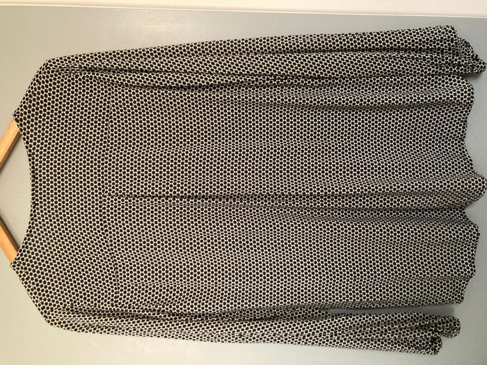 Blouse Cache Cache, pas d'étiquette. Contour brillant (strass) autour du col et cou. Bouton bout des manches. Longueur épaule jusqu'en bas 67 cm devant, derrière 70 cm. Largeur aisselle-aisselle 55 cm. Bouton pour retrousser les manches.