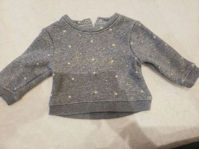 Pull gris a fleurs Taille 1mois Marque kiabi Polaire a l'intérieur En très bon état Sans taches ni trous