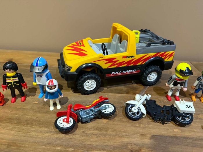 Playmobil pick up, motos et personnages Bon état Certaines pièces sont manquantes ( visibles sur les photos) À vendre ce qui se trouve sur les photos Playmobil pick up, motos et personnages