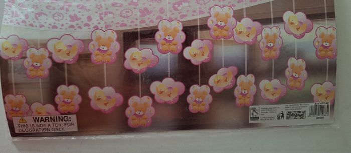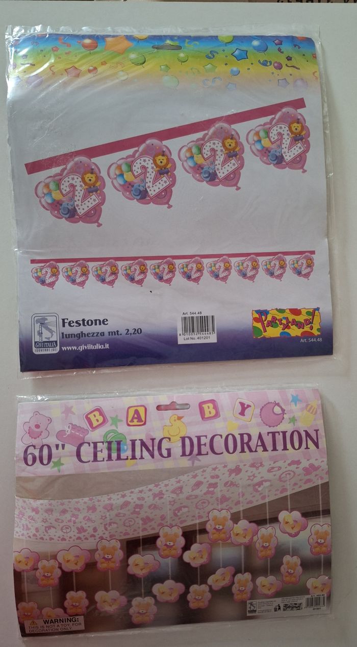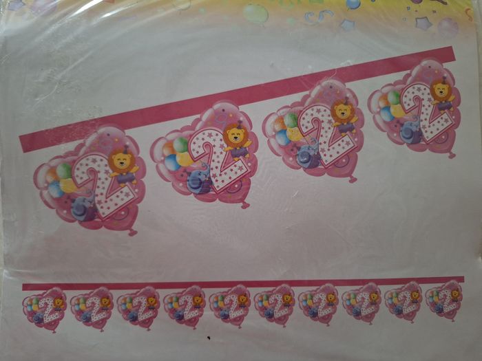 Lot de 2 banderoles cartonnées à suspendre pour les 2 ans d'une fillette. Une banderole est imprimée du chiffre 2, d'un lion, d'un éléphant et de ballons sur un coeur et mesure 2,20 mètres. L'autre banderole est imprimée d'ours et de canards et mesure 60 cm.