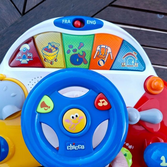 Volant interactif Chicco bilingue français/anglais. Jeu d’éveil avec sons, lumières et musiques. Permet d’apprendre chiffres, mots et situations du quotidien. Fonctionne parfaitement. Bon état avec quelques traces normales d’usage (voir photos). Idéal dès 12 mois. Prêt à jouer 👍