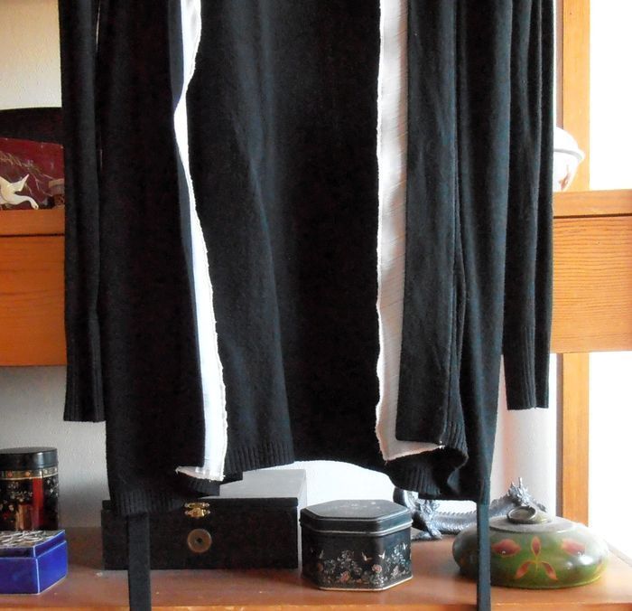Gilet long femme, marque : By Laetitia, taille S 36, couleurs noir et tulle blanc, manches longues, ruban tissu à nouer à la taille. Agréable à porter en intérieur, comme en extérieur, tissu fin et fluide. Bien pour toutes saisons !