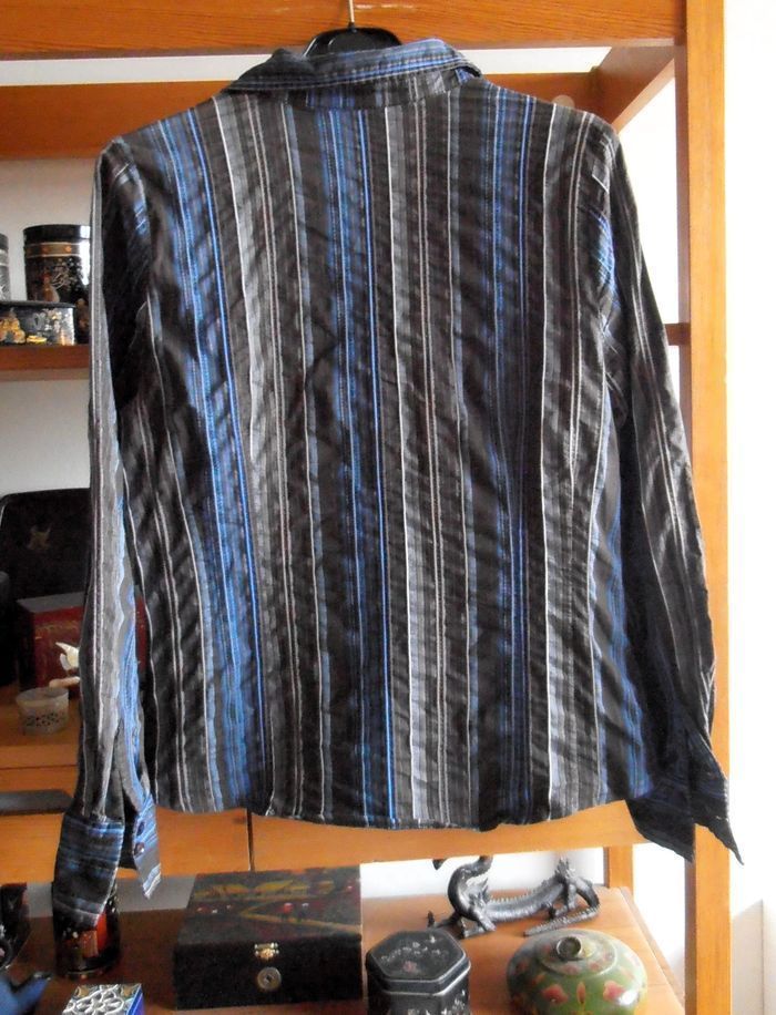 Chemise femme, marque M&S Mode, collection Best basics, taille 42 XL, couleur noire, bleue et gris à rayures verticales, 69 % de coton, manches longues, col en V, cintrée, boutons (+ un de rechange). Très bon état. Bien en toutes saisons. Look féminin et casual !