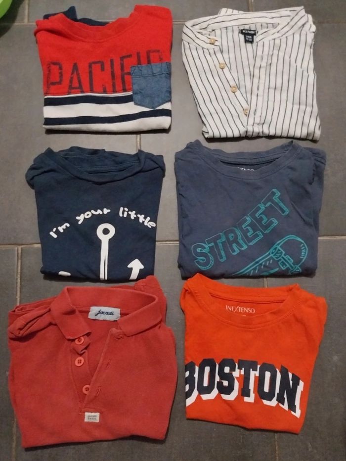 Lot de 6 tee shirts manches courtes taille 3ans en très bon état sauf le 3ème une légère tâche noir qui se voit à peine. Le 2ème est en taille 2ans mais taille comme du 3ans.