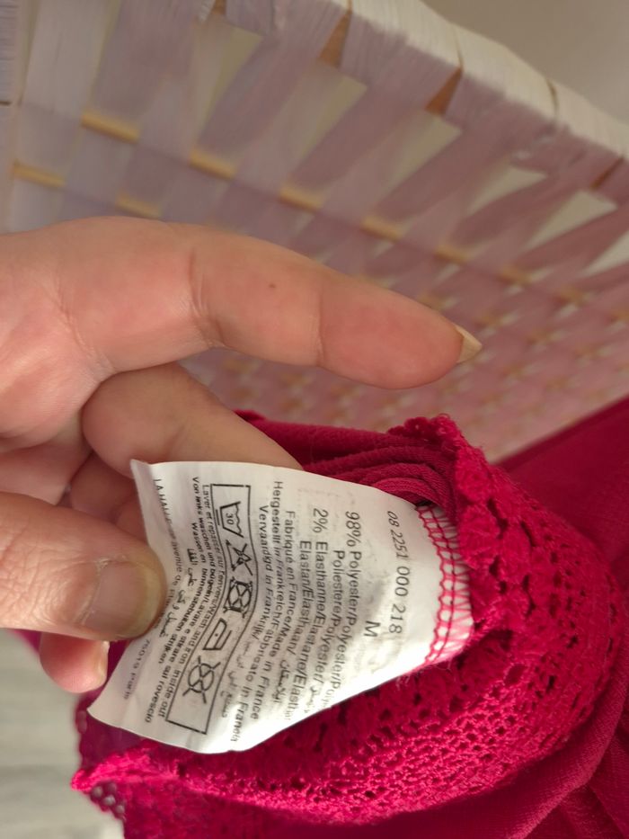 Joli top / tunique fuchsia Boho Chic mosquitos femme TM / 38 ​ ​Sublime tunique sans manches de couleur rose fuchsia / framboise, idéale pour un look bohème et estival. La matière est légère et légèrement texturée (effet crépon), très agréable à porter. ​Détails qui font la différence : • ​Col en V avec fermeture éclair fonctionnelle ornée d'un joli pompon assorti. • ​Finition dentelle/crochet délicate sur tout le bas du vêtement. • ​Coupe évasée (trapèze) très fluide, parfaite pour toutes les morphologies. • ​Fabrication Française (vu sur l'étiquette). ​✅️ État et caractéristiques : • ​📏 Taille : M (convient à un 38 ou 40 grâce à sa coupe ample). • ​🎨 Couleur : Rose Fuchsia / Rose Indien. • ​🧵 Matière : 98% Polyester, 2% Élasthanne (ne se froisse pas, idéal pour les vacances !). • ​✅️ Condition : Excellent état. ​🏠 Maison non-fumeur 📦 Envoi rapide et soigné 💡 N'hésitez pas à faire un lot pour bénéficier de réductions sur les frais de port et sur le prix des articles ! #ribeirozazafemme38 #débardeur #débardeur38 #débardeurfemme #38femme #femme38 #blouse #blousefemme #blousefemme38 #etefemme #ete38 #etefemme38 ​#robeete #tuniqueboheme #topfuchsia #dentelle #bohochic #taille38 #vêtementfemme #modefrancaise #tuniquelegere #fuchsia #ribeirozazafemme38