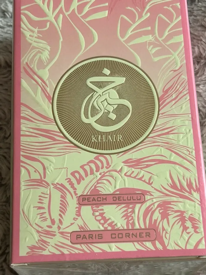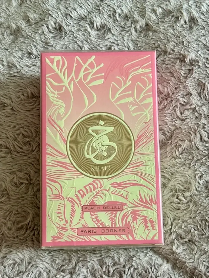 Eau de parfum 100ml- KHAIR PEACH DELULU de PARIS CORNER. Modèle authentique, fabriqué aux Emirats. Parfum gourmand unisexe. Notes de tête : Pêche, Goyave et Nectarine. Notes de coeur : Gingembre et Cardamome. Notes de fond : Caramel, Musc et Bois sec. NEUF, sous blister.