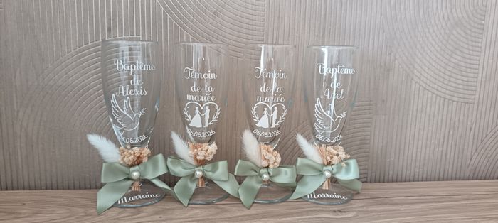 lots de 6 flûtes personnalisées la mariée le marié témoin de la mariée x2 témoin du marié x2 dessin 2 mariés date a définir bouquet , nœud vert sauge perle blanche