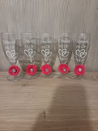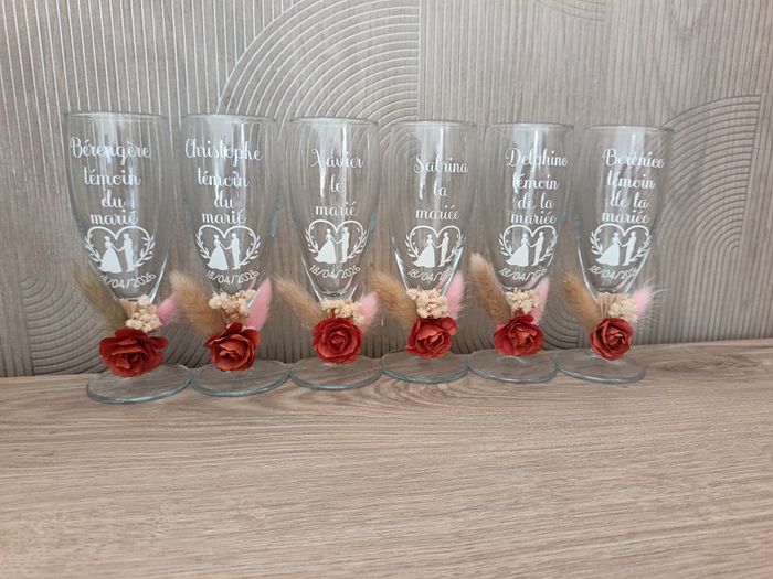 lots de 6 flûtes personnalisées la mariée le marié témoin de la mariée x2 témoin du marié x2 dessin 2 mariés date a définir bouquet terracotta