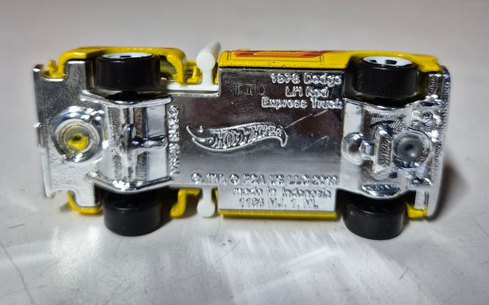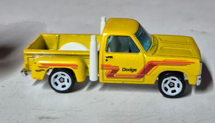 Modèle réduit Hot Wheels 1978 Dodge L’il Red Express Truck, carrosserie jaune avec décorations latérales Dodge et échappements verticaux blancs derrière la cabine. Vitrages bleus, roues blanches et benne avec roue de secours moulée. Châssis métal estampillé Hot Wheels 1978 Dodge L’il Red Express Truck, fabrication Indonésie, ©2018. Modèle présentant des traces d’usage et usure de peinture #hotwheels #dodge #lilredexpresstruck #pickupminiature #voitureminiature #diecast #hotwheelscollector #modelereduit #pickup