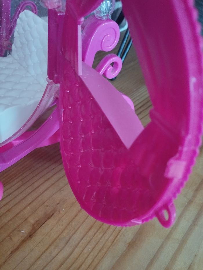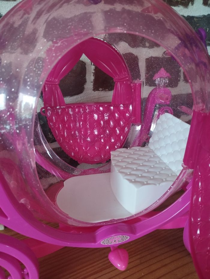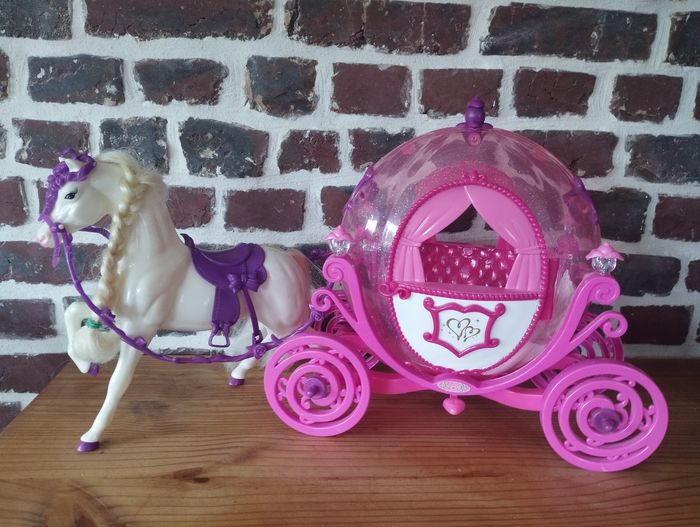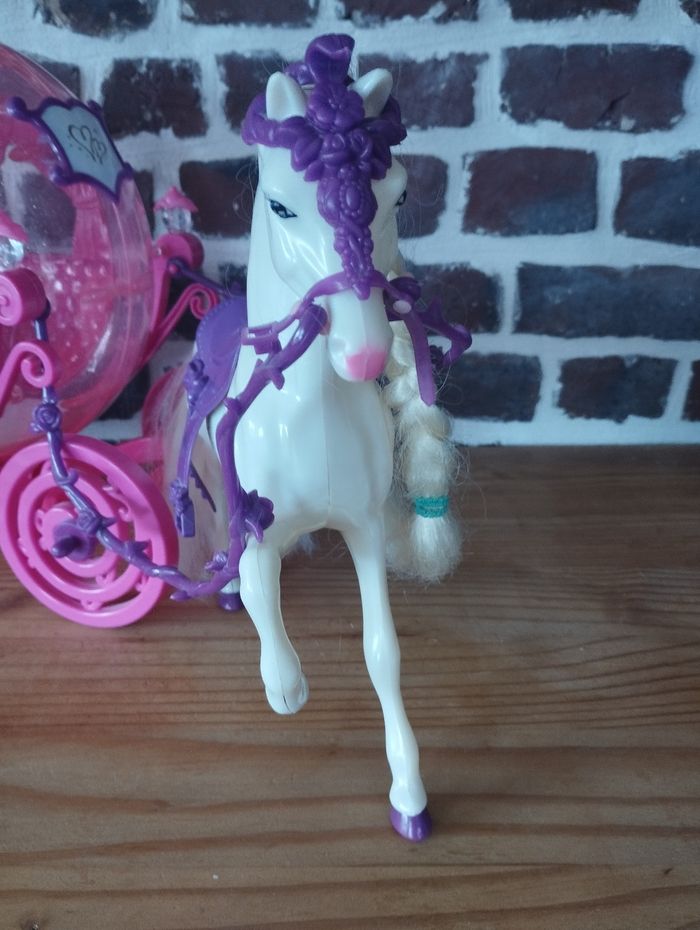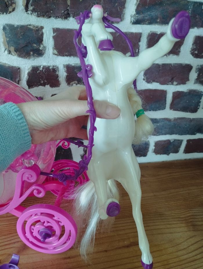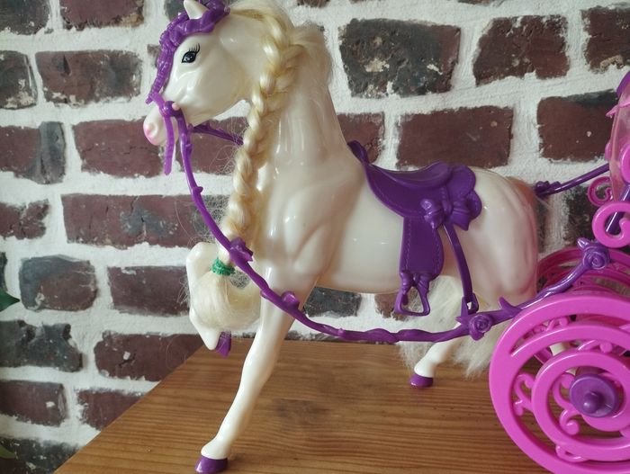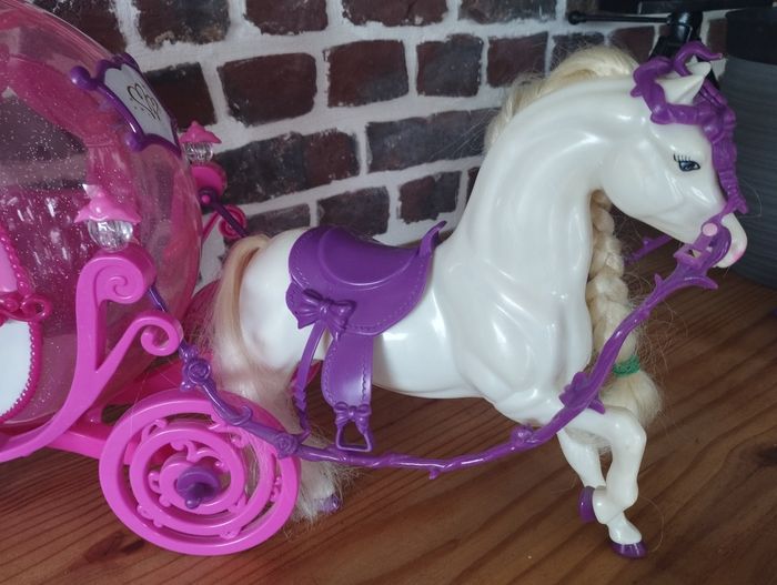 Carrosse de princesse et cheval pour poupées Barbie ou de taille similaire Les portes s'ouvrent, il y a la place suffisante pour une barbie (voir deux) A servi principalement en déco, très bon état. Juste un petit choc sur la sangle au dessus de la tête