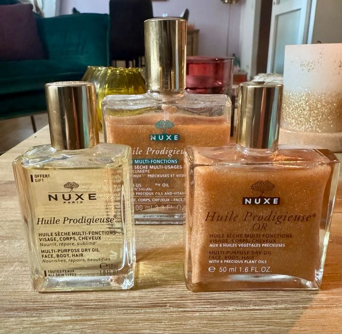 Marque : NUXE Produit : Huile Prodigieuse Vl Lot de 3 huiles - NEUVES • Contenu du lot : • Huile Prodigieuse Or - 50 ml • Huile Prodigieuse Or - 100 ml • ½ Huile Prodigieuse classique - 30 ml État : NEUF - jamais utilisé • Non ouvertes / jamais appliquées Iconique et multi-usage, l'Huile Prodigieuse NUXE nourrit, répare et sublime le visage, le corps et les cheveux. Les versions Or illuminent la peau grâce à leurs nacres dorées, idéales été comme hiver, tandis que la version classique apporte nutrition et éclat au quotidien. Parfait pour : • se faire plaisir • offrir • ou constituer une routine complète NUXE it • Vente en lot uniquement Envoi rapide et soigné roi Photos supplémentaires sur demande • N'hésite pas à me contacter si tu as des questions.