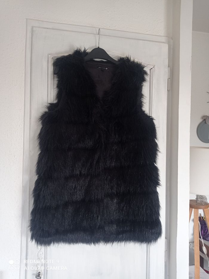 Veste sans manche en fausse fourrure noire taille 40 avec 2 poches de côté, agrafes pour fermeture, entièrement doublée. Parfait état, comme neuf.