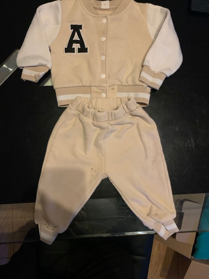 Très joli ensemble composé d’une veste boutonnée avec lettre “A” et d’un pantalon assorti. Couleur beige/crème, matière douce et confortable. ⚠️ À noter : quelques petites taches visibles sur le pantalon (voir photos), prix en conséquence. Taille : bebe 9-12 mois État : bon état général malgré les taches