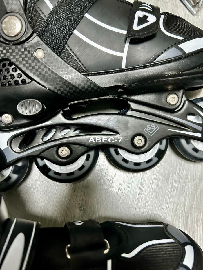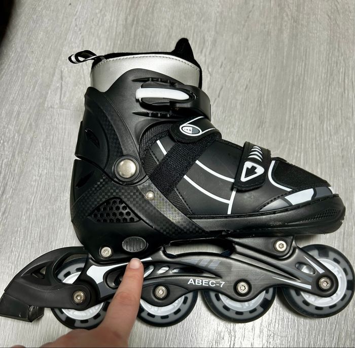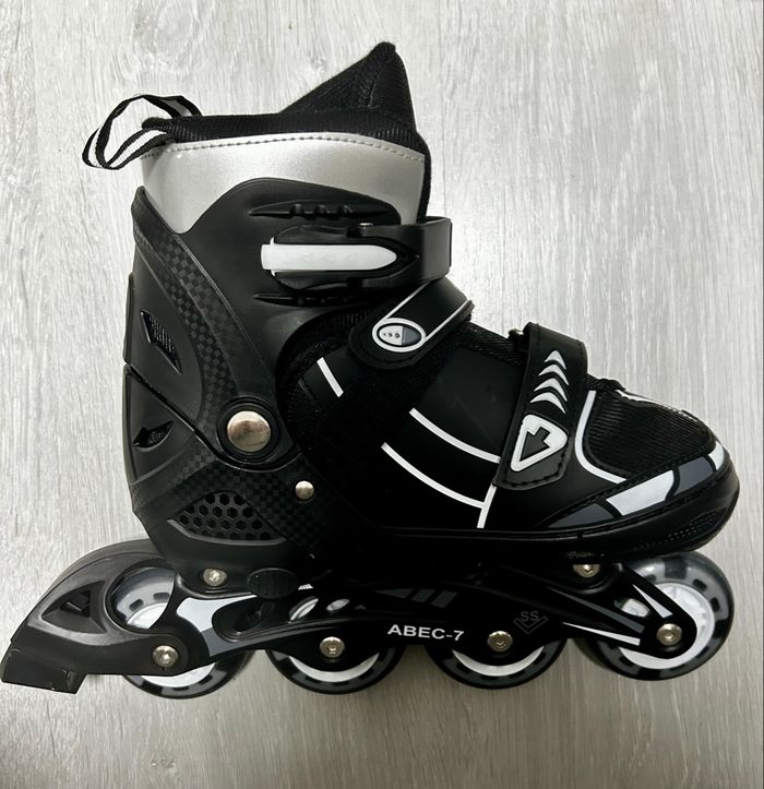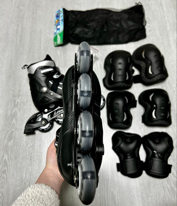 Paire de rollers noirs avec détails gris/blanc, vendus avec le kit complet de protections (genouillères, coudières, protège-poignets / mains), un sac de transport filet et les vis/clé d’ajustement. ✔️ Taille évolutive 35 → 38 ✔️ Système de réglage simple et rapide (photo 5) ✔️ Roulements ABEC-7 ✔️ Frein arrière inclus ✔️ Fermeture sécurisée (boucle + scratch + lacets) ✔️ Protections assorties et confortables ✔️ Idéal débutant / loisir Jamais servi, en très bon état. Parfait pour débuter le roller en toute sécurité 😊 💬 N’hésite pas à me contacter pour plus d’infos ou photo supplémentaires ou si vous souhaitez proposer des offres ;)