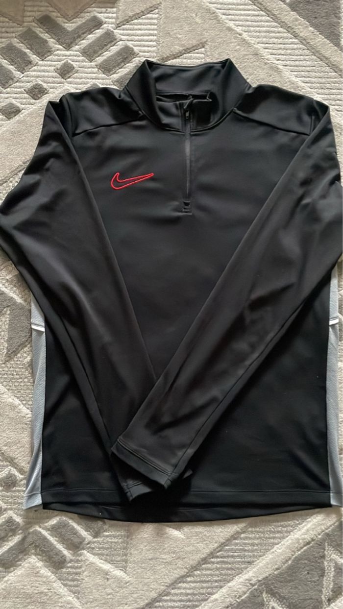 Je vends ce haut de survêtement Nike Academy 1/4 Zip Top de couleur noire et rouge. - Type de produit : Haut de survêtement - Marque : Nike - Taille : M - Couleur : Noir et rouge - Caractéristiques : Fermeture éclair 1/4, Coupe droite N'hésitez pas à me contacter pour plus d'informations ou de photos.