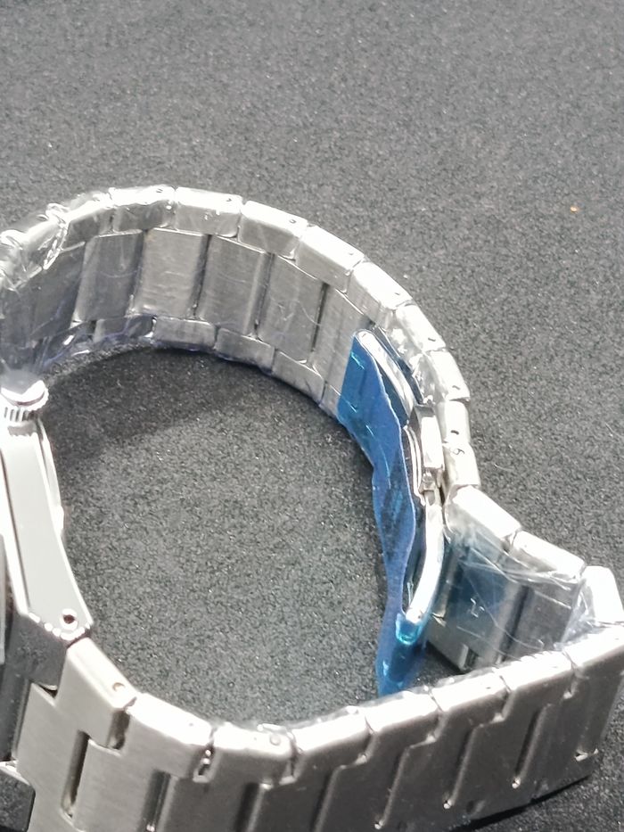 Montre neuf Encore le filme plastique Envoi rapide et très bien protégé Il faudra ajuster la poignée car trop grande ( avec le petit outil noir fourni avec ) Il faudra enlever la petite protection en place au niveau de la maulette pour démarrer la montre , c'est fais exprès pour ne pas usé la montre .
