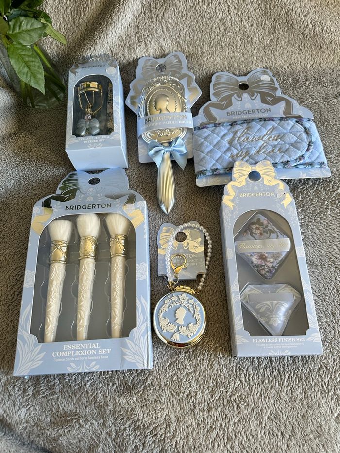 * Brosse à cheveux plate lissante * Brosse à cheveux compacte * Bandeau de spa au style Bridgerton * Lot de trois pinceaux de maquillage * Recourbe-cils et pince à épiler * Deux houppettes de maquillage * neufs, jamais utilisés, comme sur le photo