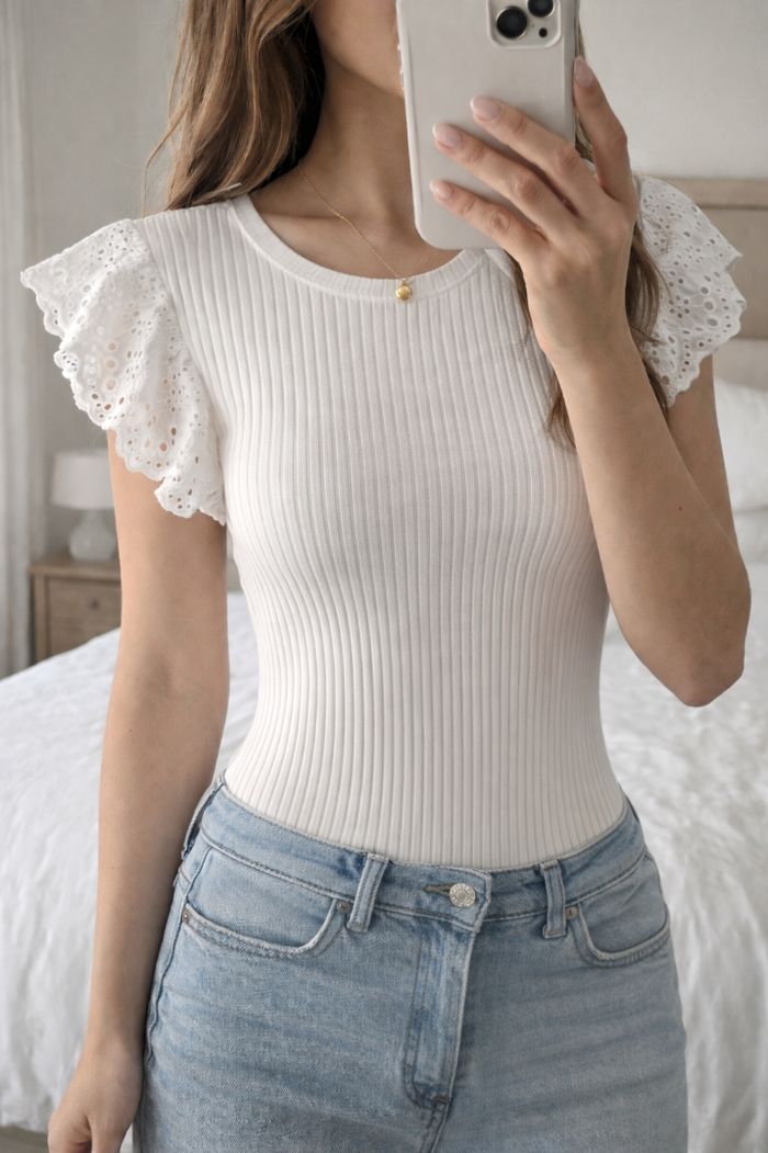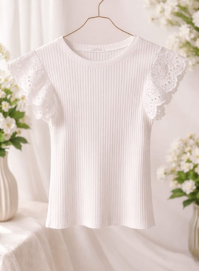 Haut blanc Je vends ce joli haut blanc côtelé de la marque cache-cache, taille S. Un modèle féminin et élégant avec ses manches courtes volantées en broderie anglaise Marque : Cache-cache Taille : S Couleur : blanc Matière côtelée, confortable et agréable à porter Manches à volants en broderie anglaise Col rond Coupe près du corps Très bon état, propre et bien entretenu. Parfait pour le printemps/été, facile à assortir avec un jean, un short ou une jupe