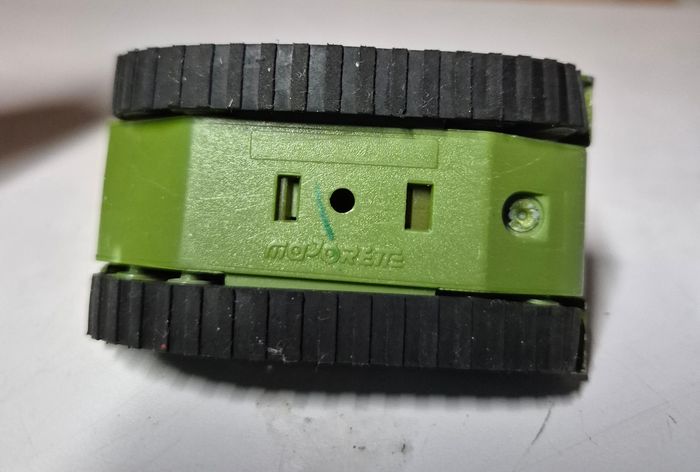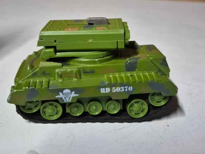 Modèle réduit Majorette représentant un char militaire vert avec lance‑missiles supérieur. Carrosserie en plastique avec détails moulés, chenilles noires et marquages blancs RD 50370. Tourelle orientable et décor camouflage sur certaines parties. Châssis estampillé Majorette. Modèle présentant des traces d’usage et usure de peinture. Etat conforme aux photos #majorette #char #tank #vehiculetmilitaire #majorettevintage #miniaturemilitaire #voitureminiature #diecast #modelereduit