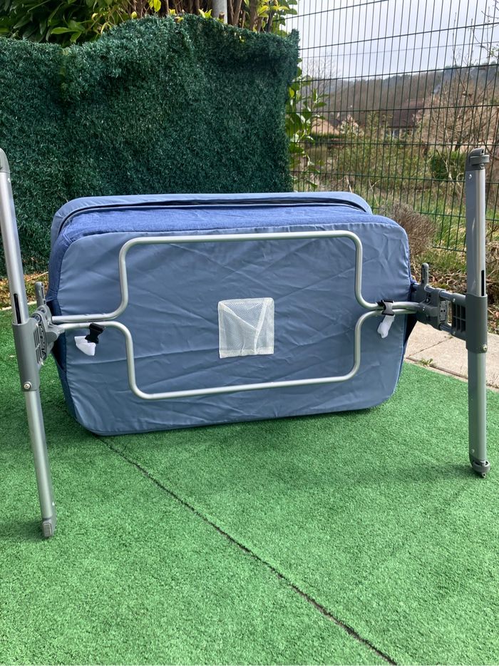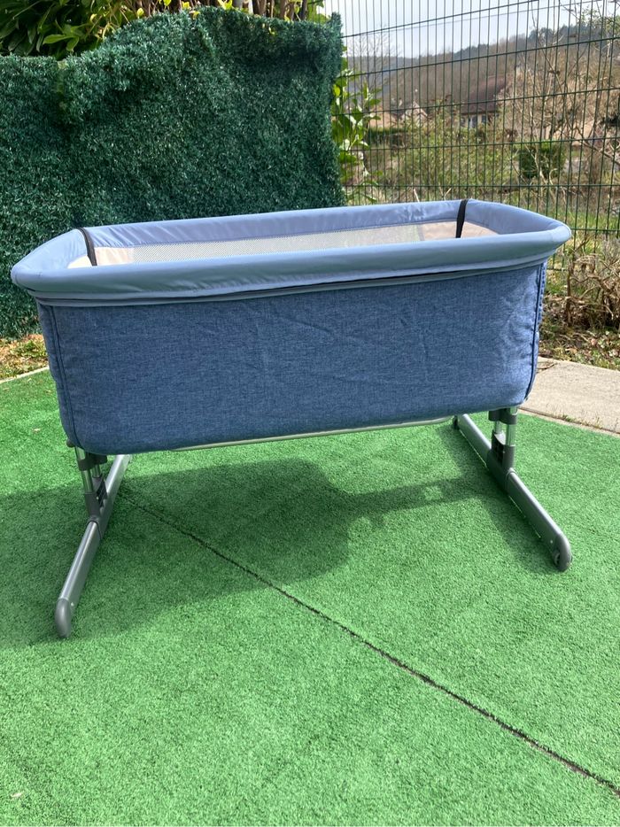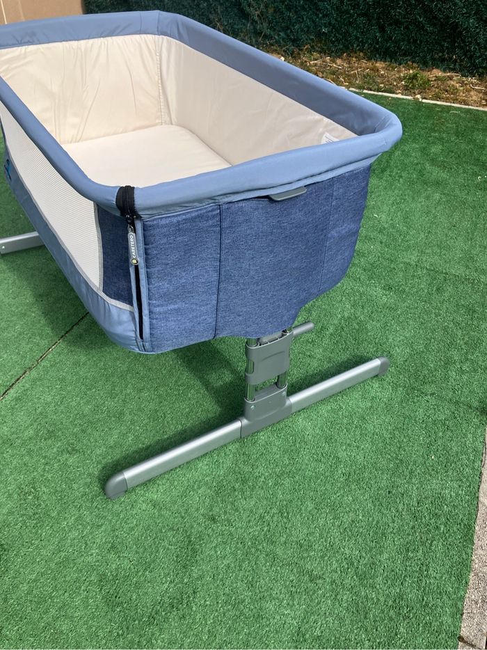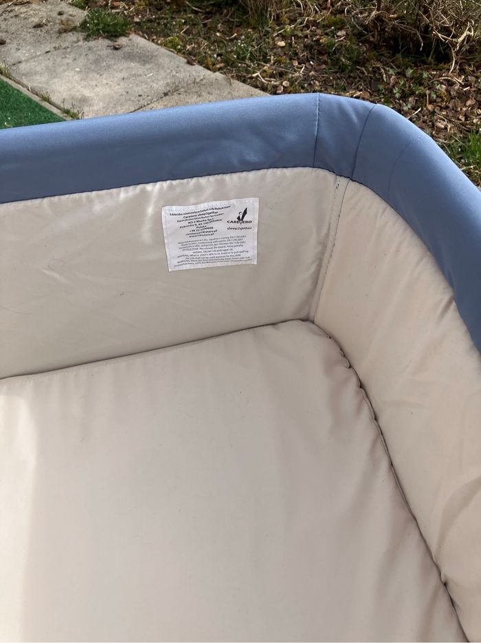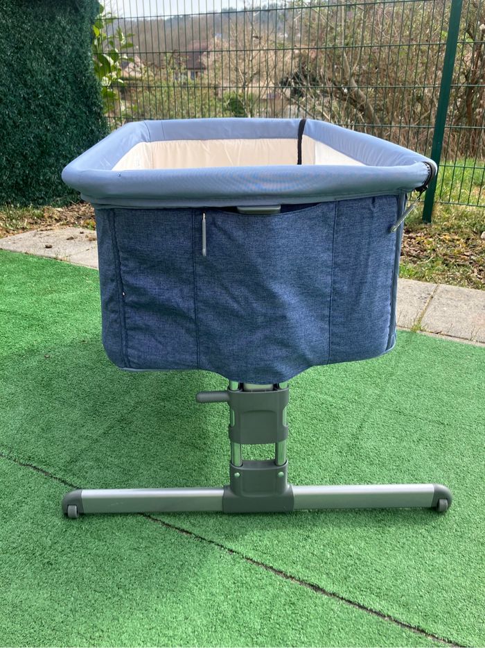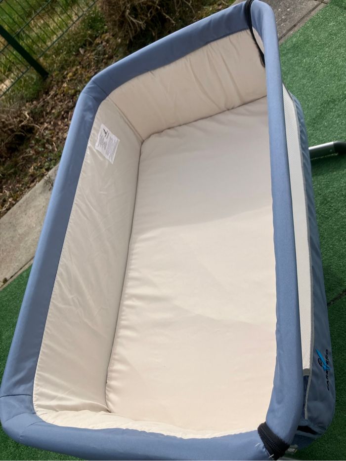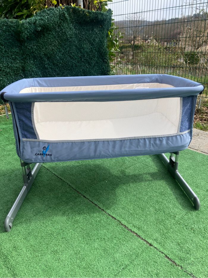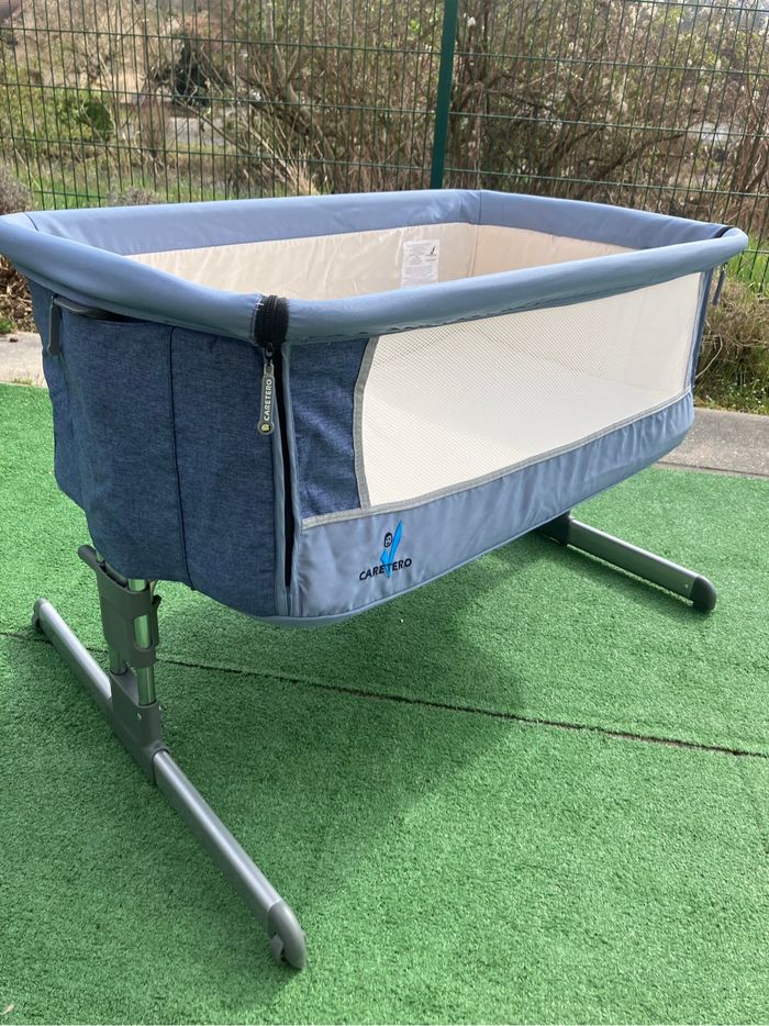 CARETERO Sleep2gether Jusqu'à 9 Kg Lit d'appoint ou jumelé au lit des parents. La paroi latérale peut être ouverte ou fermée. Pieds réglables en hauteur sur 7 positions (20 cm). Ils se déplacent sur la largeur pour ajuster la distance entre le berceau et lit des parents. Possibilité d'incliner le lit. Matelas en mousse (souple et épais) et ceintures de raccord au lit des parents inclus. Cadre en aluminium (léger) et roues Conforme à la norme européenne EN 1130. DIMENSIONS ET POIDS : Dimensions extérieures : L. 95 X P. 70 X H. 62-82 cm. Dimensions internes : L. 85 X P. 52 X H. 32 cm. Poids : 8, 4 kg. Envoi démonté dans son carton