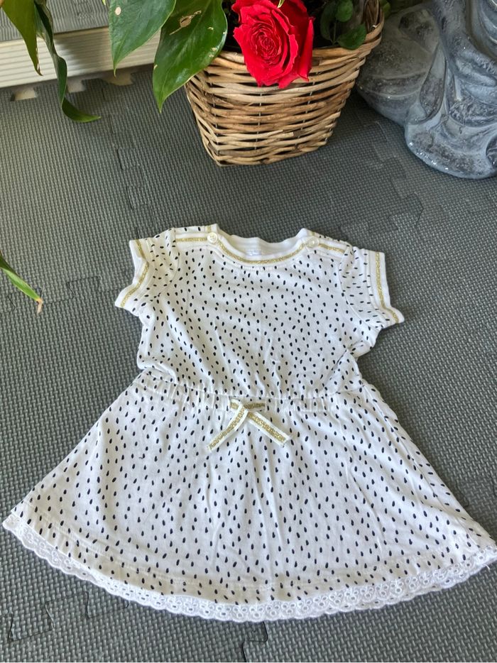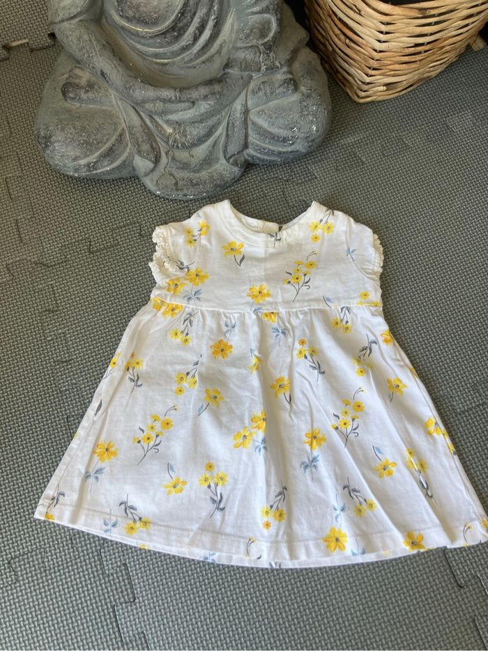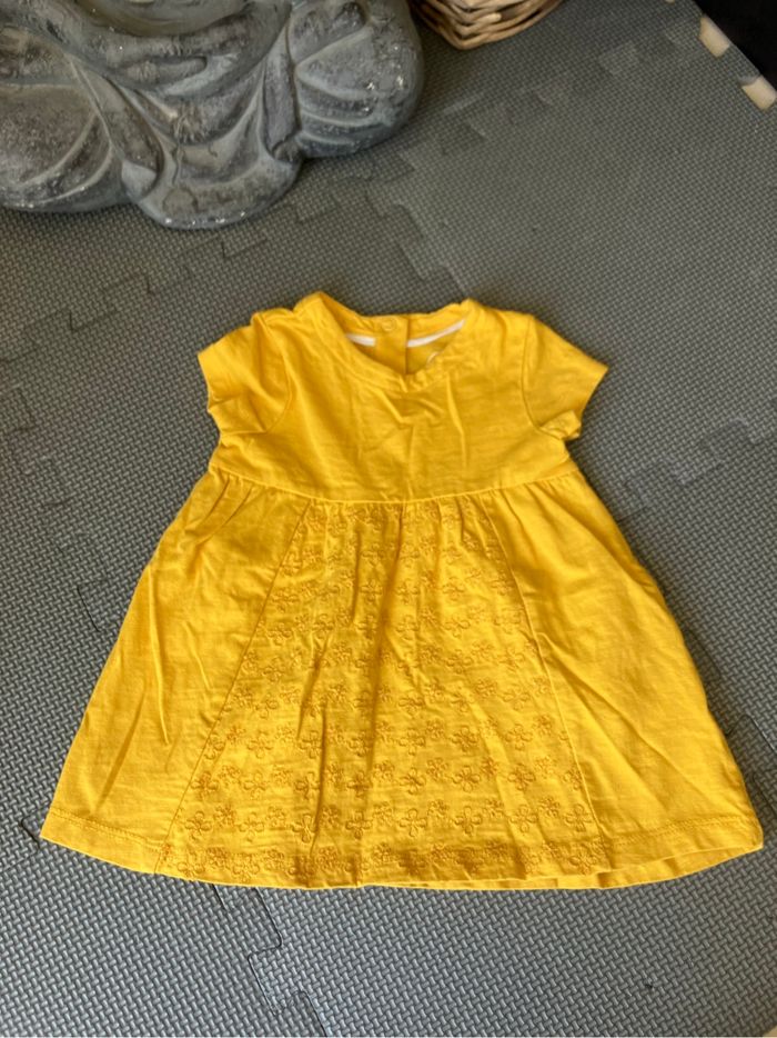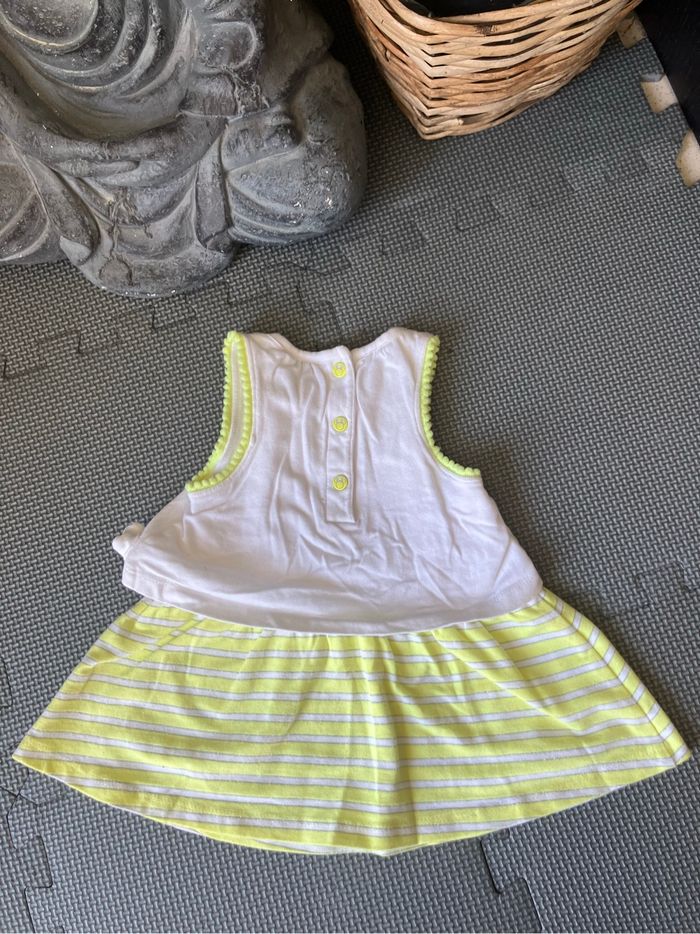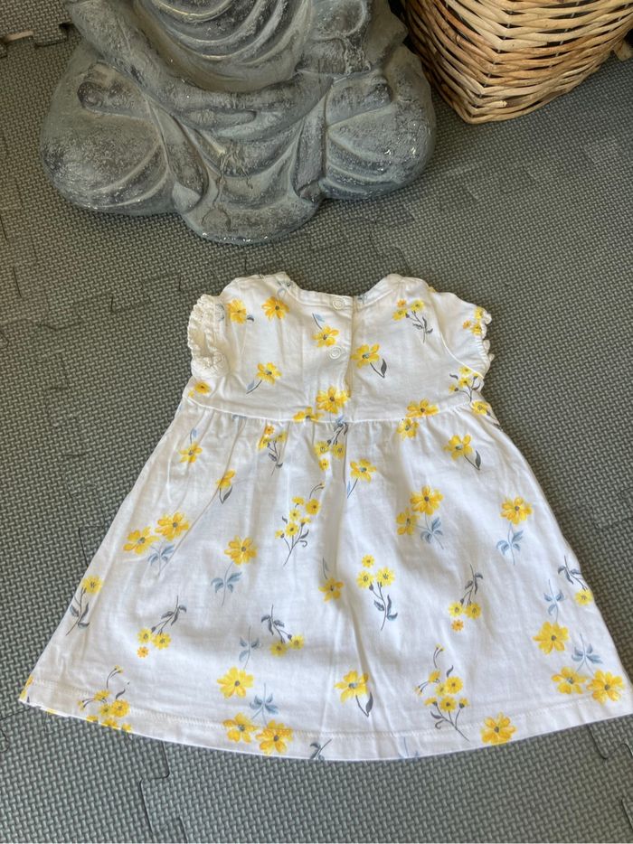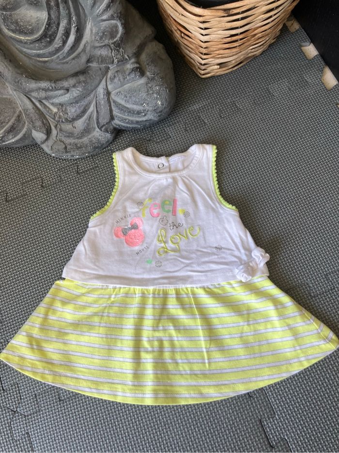 5 articles portés 1 ou 2 fois - 1 Robe Orchestra Minnie Mouse - 1 Kiabi - 2 Robes baby club jaune et fleurie (62cm) - 1 Robe blanche Orchestra Avec liserés dorés et petite bordure dentelle sur le bas de la robe Robe