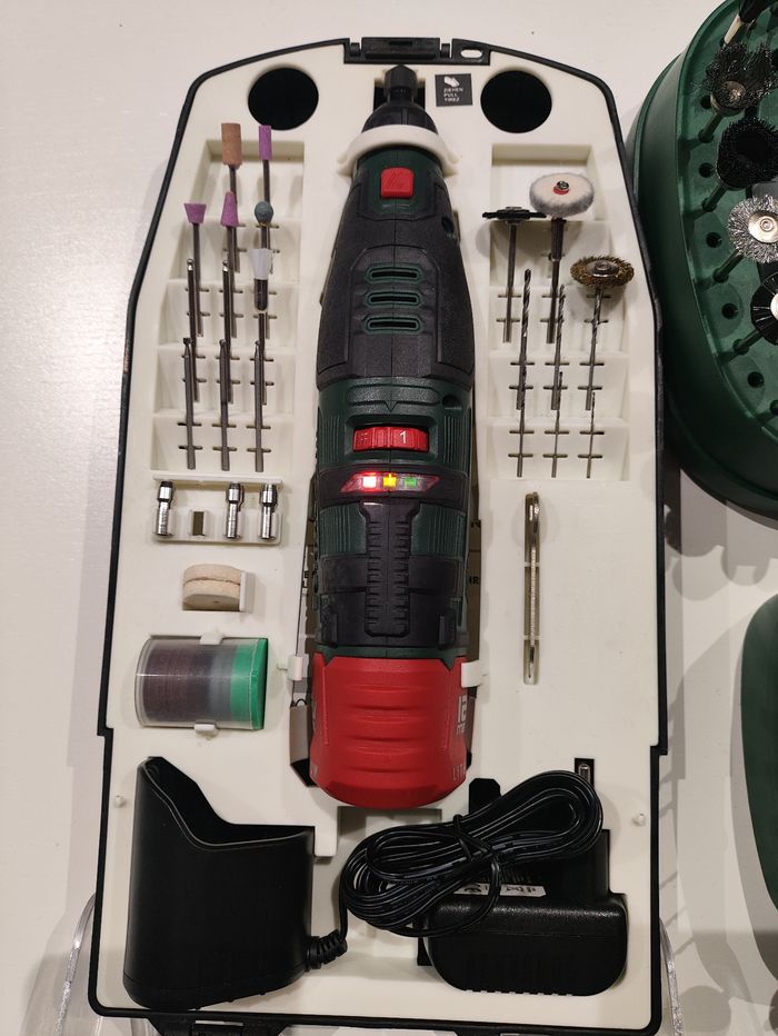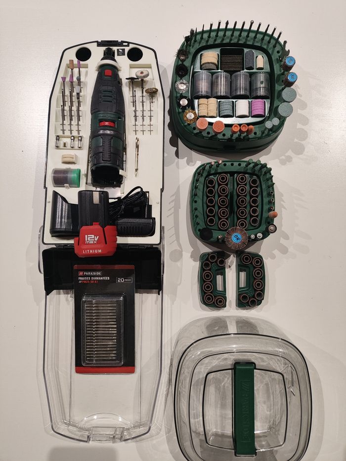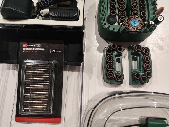 Lot Perceuse Meuleuse de Précision Sans Fil Parkside - PFBS A1 sur Batterie 12V Max + 20 Fraises Diamantées PMZS + Coffret Set d'Accessoires - photo numéro 1