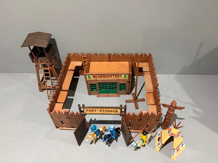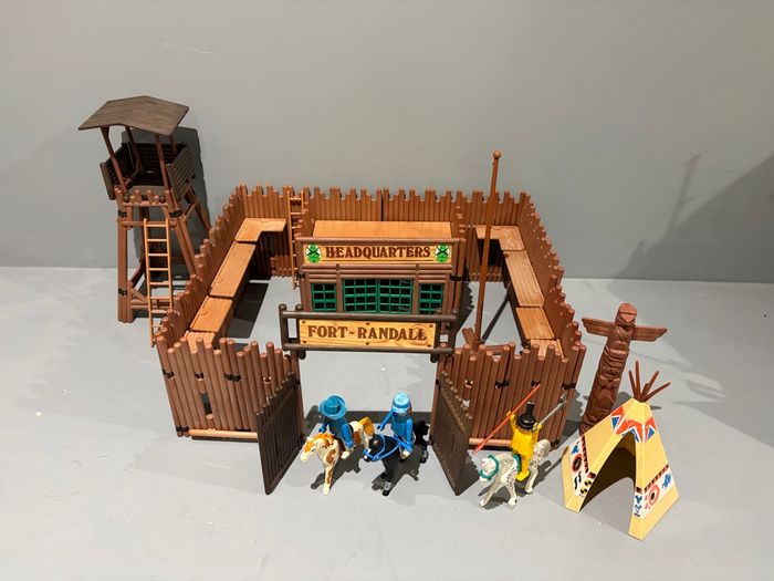 Playmobil Fort Randall Western vintage cowboy Indien Tour de garde Quartier général  2 Échelles  Mat pour drapeau Tipi Totem 2 gardes 1 indien 3 chevaux